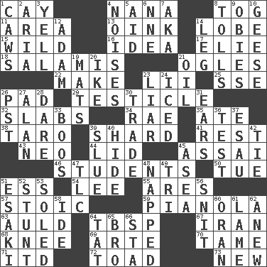 ACROSS 1. Island 4. Nanny 8. Coat; cloak 11. Length times width 13. Pig sound 14. Ear part 15. Rampant 16. It may be bright or harebrained 17. Writer Wiesel 18. Deli grouping 21. Stares at amorously 22. Cause to be 23. Cards in a Roman deck? 25. Compass dir. 26. Groovy apt. 29. One of the two male reproductive glands 32. Thick slices 34. Actress Charlotte 35. Had dinner 38. Pacific island yam 39. Broken piece 41. Relief 43. Modern: prefix 44. Hat (slang) 45. Slender Brazilian palm 46. SAT takers 50. Third day of the wk. 51. Double-curved letter 54. Area sheltered from the wind 55. Ancient Greek god of war 57. Unemotional 59. Player piano 63. Old (Scot.) 64. Cook's measure (abbr.) 67. SW Asia republic 68. Leg joint 69. Johnson of "Laugh-In" 70. Not wild 71. It would 72. Frog relative 73. ___ Haven, CT DOWN 1. Crow sounds 2. Operatic vocal solo 3. Shout 4. Annoying sounds 5. Assist 6. Compass dir. 7. Alias (abbr.) 8. For Whom the Bell _____ 9. Off-Broadway awards 10. Honkers 12. First man 14. Part of a journey 19. Floor coverings 20. D.D.E's nickname 21. Lubricate 23. One who doesn't tell the truth 24. On the rocks 26. Pacific Standard Time (abbr.) 27. Actor Alda or Thicke 28. Have the gumption 30. Swap 31. Hearing organs 33. Expressions of contempt or scorn 36. Trial 37. Son of Isaac 39. Change direction abruptly 40. Flintstone garb 42. Standoff 45. At sea 47. Affectionate concern, for short 48. Slept 49. Three (prefix) 51. 1973 Nobel Price Winner (Physics) Leo 52. Check the growth or development of 53. Having a sole or soles 56. In a ____ (agitated or irritated) 58. Binary compound 60. NW Algerian seaport 61. Unable to walk 62. Afresh 64. Make lace 65. Sis' sibling 66. R.R. building
