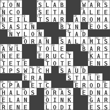 ACROSS 1. Electrically charged atom 4. Broad, flat, thick piece 8. Armed conflicts 12. Non-commissioned officer (abbr.) 13. Bristle 14. Toward shelter 15. Famous astronaut Armstrong 17. Russian ruler of old 18. Odor 19. Indian antelope 21. Storage container 23. Greek goddess of the dawn 24. High-strength synthetic material 26. Small boy 28. NW Algerian seaport 30. Deli grouping 34. Leather borer 37. Lacquered or enameled metalware 39. Taverns 40. Born 41. Spew [out] 43. Krazy ___ of comics 44. Wig 46. Carryall 47. Followers of ems 48. NE Massachusetts town 51. Saudi Arabian king (1953-1964) 54. Period 55. Having lost freshness 58. Numbers guy (abbr.) 61. And so on (abbr.) 63. Eat (away) 65. Radiant circles of light 67. Mouths or openings 71. Pulitzer Prize-winning author Ferber 72. Liveliness 73. Pig sound 74. Slender fish 75. French philosopher Descartes 76. Farming town in central California 77. Double-curved letter DOWN 1. Taverns 2. Sea 3. Annoyingly loud 4. Fast jet (abbr.) 5. French article 6. "One Day ___ Time" 7. Sharp remark 8. Armed conflict 9. Medicinal plant 10. San ____ (Riviera town) 11. Oceans 16. _ and Stitch 18. Of or related to the anus 20. Not either 22. Call ___ day 25. Nathan's nickname 27. Small moist lump or mass 29. 0 degrees 30. Religious groups 31. Cause to be 32. SW Asia republic 33. Fast planes 34. Opposed to 35. Shed a tear 36. Allows 38. Nilotic language 42. Afternoon social gatherings 45. She-sheep 49. Angers 50. Domesticated feline 52. Shoshoni 53. Have the gumption 56. Inn 57. Ferber et al. 58. "Mermaids" star 59. Diluted with white 60. ____ Jay Lerner 62. Calm and collected 64. Hearing organs 66. Single 68. River (Sp.) 69. Added to 70. What Jean-Claude Killy likes to do