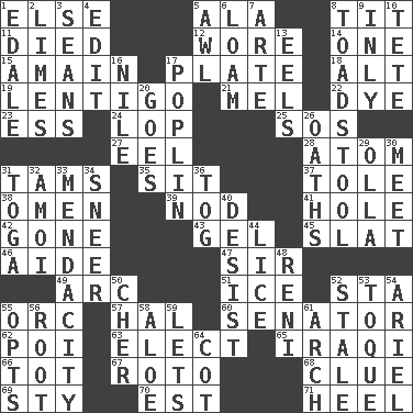 ACROSS 1. Otherwise 5. Insect wing 8. Teat (slang) 11. Passed on 12. Had on 14. Single 15. With great haste 17. Food holder 18. Keyboard modifier key 19. Small, flat, pigmented spot on the skin 21. Cartoonist voice _ Blanc 22. Color 23. Curvy letter 24. Trim (branches) 25. Distress signal 27. Snakelike fish 28. Smallest unit of an element 31. Scottish caps 35. Be seated 37. Lacquered or enameled metalware 38. Presage 39. Allow head to fall sleepily 41. Hollow 42. Went 43. Set 45. Narrow board 46. Helper 47. Title for a knight 49. Curve 51. Frozen water 52. R.R. building 55. The grampus (Milton) 57. Actor Linden 60. Elected representative 62. Luau course 63. Voters do this 65. Resident of Iraq 66. Small child 67. Printing process, for short 68. A slight indication 69. Filthy place 70. Eastern Standard Time (abbr.) 71. The bottom of a shoe or boot DOWN 1. Peak District village in England 2. Citrus fruits 3. Actors Connery and Penn 4. Prepare for publication 5. Leather borer 6. Rich soil 7. Johnson of "Laugh-In" 8. Inedible or poisonous agaric 9. In an inward manner 10. False hair 13. Snakelike fish 16. Mediterranean tributary 17. Cotton for raincoats, e.g. 20. Moves 26. Expletives 29. Rounded earthenware pot or jar 30. Confront 31. Ancient Roman robe 32. Mine, in Marseilles 33. Ananias' fault 34. Scornful expression 36. Coat; cloak 40. Stop 44. Louse (plural) 48. Painter Guido (1575-1642) 50. "Mermaids" star 52. Lacking originality or spontaneity 53. Woman's close-fitting hat 54. Satellite of Uranus 55. Elects 56. Carrot, for example 58. _ vera 59. Allows 61. Bowlike part 64. Small bed