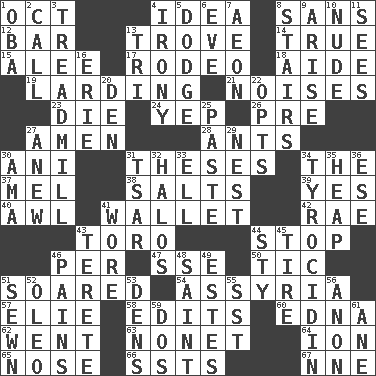 ACROSS 1. Sep. follower 4. It may be bright or harebrained 8. Without 12. Oblong piece of solid material 13. Collection of objects 14. Loyal 15. Toward shelter 17. Cowboy competition 18. Helper 19. Preparing or cooking with lard 21. Annoying sounds 23. Expire 24. Slangy assent 26. Before (prefix) 27. So be it 28. Pismires 30. Black tropical American cuckoo 31. College papers 34. Definite Article 37. Cartoonist voice _ Blanc 38. Table seasonings 39. Affirmative reply 40. Leather borer 41. Place for singles 42. Actress Charlotte 43. "Corrida" creature 44. Obstruct or block passage 46. For each 47. Compass dir. 50. Nervous spasm 51. Flew 54. Nineveh was its capital 57. Writer Wiesel 58. Prepares for publication 60. Pulitzer Prize-winning author Ferber 62. Left 63. Music written for nine 64. Electrically charged atom 65. Sense of smell 66. Fast planes 67. Compass dir. DOWN 1. Chief or king in Benin or Nigeria 2. Give a ring to 3. Excercise machine 4. Literary sarcasm 5. Evade 6. Night before a holiday 7. A really long time 8. Flight of steps 9. Originate 10. Unadorned 11. Perceives with the eye 13. Three (prefix) 16. One of the Great Lakes 20. Lair 22. Elects 25. Thick mixture 27. Afresh 29. A home for chicks 30. Nursemaid (var.) 31. Russian ruler of old 32. Saint headwear 33. Pipe bend 34. Polypeptide antibiotic 35. Pile 36. Compass dir. 41. Had on 43. Cigar-shaped 44. Filthy place 45. Hoop that covers a wheel 46. Aches 48. Inhabitant of Heaven 49. _____ Park, CO 51. Stitched 52. Margarine 53. Cub Scout units 55. Fast jet (abbr.) 56. At once, immediately (arch.) 59. Two (Sp.) 61. A saturated hydrocarbon
