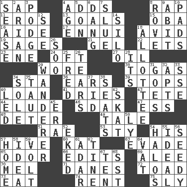 ACROSS 1. Plant excrement 4. Sums up 8. Strike 11. Greek god of love 13. Purposes of endeavors 15. Chief or king in Benin or Nigeria 16. Assistant 17. World-weariness 18. Enthusiastic 19. Gurus 21. Set 22. Allows 23. Compass dir. 24. Often (poetically) 27. Lubricate 29. Had on 30. Ancient Roman robes 34. R.R. building 36. Hearing organs 39. Ceases 40. Grant temporary use of 41. Frees from moisture 43. False hair 44. Dodge 46. Neighbor of Neb. 47. Curvy letter 48. Prevent from occurring 49. Falsehood 51. Actress Charlotte 53. Filthy place 54. Part of HMS, perhaps 57. Hub of activity 60. Krazy ___ of comics 63. Elude 65. Scent 66. Proofreads 69. Toward shelter 70. Cartoonist voice _ Blanc 71. Natives or inhabitants of Denmark 72. Frog relative 73. Consume 74. Monthly bill 75. Secret DOWN 1. Gospel singer Marvin 2. Believer in; advocate of (suffix) 3. Porridge 4. Mature 5. Spanish title 6. Mild oath, euphamism for damn 7. Turn sharply 8. Be footloose 9. "This won't hurt ____!" 10. Writing tablets 12. Observe 14. Grain storage tower 18. One to whom something is allotted 20. "Barney Miller" actor Jack 25. Flintstone 26. Pulls apart 28. ___ a Wonderful Life 29. Nomad 31. Moves 32. Flats, for short 33. Compass dir. 34. Not divided or shared with others 35. Strained 37. To free from 38. Theater features 40. Directed 42. Three-handed card game 45. Epoch 50. Potassium hydroxide 52. Made supply last 54. Auras 55. Standard of perfection 56. Shabby and untidy 57. Residence 58. The content of cognition 59. Electrical Unit 61. The sixth month of the Jewish calendar 62. Prong on a fork 64. Large container 67. Nine, plus one 68. Fast jet (abbr.)
