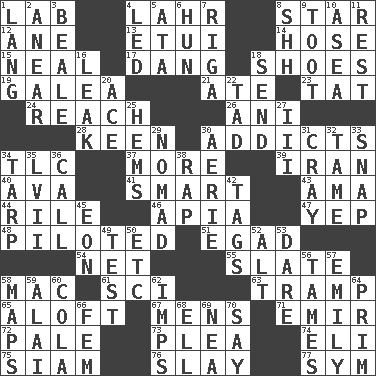 ACROSS 1. Experiment locale 4. Cowardly lion portrayer 8. Play the lead 12. A saturated hydrocarbon 13. Needle holder 14. Stockings 15. Be tempered by heat 17. Mild oath, euphamism for damn 18. Imelda's hoard 19. An organ shaped like a helmet 21. Had dinner 23. Make lace 24. Arrive at 26. Black tropical American cuckoo 28. Peachy ____! 30. Inveterate users 34. Affectionate concern, for short 37. Greater amount 39. SW Asia republic 40. Actress Gardner 41. Don Adams' spy role 43. Nursemaid (var.) 44. Cause heat under the collar 46. Capital of Western Samoa 47. Slangy assent 48. Manned the helm 51. Mild oath 54. Remaining after all deductions 55. Chalkboard 58. Big _ 61. _-fi 63. _____ steamer (cargo ship) 65. Upward 67. Not women's 71. Independent ruler or chieftain 72. Light colored 73. Entreaty 74. Connecticut Ivy Leaguer 75. Thailand, formerly 76. Kill 77. Symbol (abbr.) DOWN 1. Austrian-born American filmmaker Fritz 2. Approach 3. Calif. Air Force Base 4. Directed 5. "One Day ___ Time" 6. Attila the _ 7. Capital of Latvia 8. Quiet! 9. A blast of a horn 10. At sea 11. Respite 16. Path through which fluid escapes 18. Post 20. Adept person 22. Small amount or degree 25. Cloth borders 27. One more than two 29. Roamer 30. Nest on high 31. Supercomputer manufacturer 32. Docile 33. Fastener 34. Canvas cover 35. 57 in ancient Rome 36. Give a ring to 38. Hit sharply and swiftly 42. Labels 45. A really long time 49. Trial 50. And so on (abbr.) 52. The first octave above the treble staff 53. Have the gumption 56. Makes less strong or intense 57. Poet Dickinson 58. Atlas contents 59. Mountain range southwest of Kyrgyzstan 60. Root beer relative 62. Naughty children 64. Demure 66. Opposite of masc. 68. Pipe bend 69. Teachers' org. 70. Declare