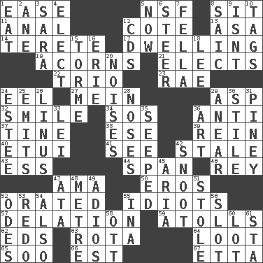 ACROSS 1. Comfort 5. Science/research agcy. 8. Be seated 11. Of or related to the anus 12. ____ d'Azur (French Riviera) 13. White ___ sheet 14. Cigar-shaped 17. Home 19. Oak nuts 21. Opts 22. Musical group of three 23. Actress Charlotte 24. Snakelike fish 27. Count _ (2 wds.) 29. Cleo's killer 32. Grin 34. Mayday 36. Opposed to 37. Prong on a fork 38. Compass dir. 39. It's straight from the horse's mouth 40. Needle case 41. Observe 42. Lacking originality or spontaneity 43. Double-curved letter 44. Connect, as a bridge 46. Marina Del _, California 47. Wet nurse (var.) 50. Greek god of love 52. Spoke pompously 55. Foolish or stupid persons 57. Accusation by an informer 59. Ringlike coral islands and reefs 62. Begley and Asner 63. Roll call or roster of names 64. Spoils 65. "Barney Miller" actor Jack 66. Eastern Standard Time (abbr.) 67. Singer James DOWN 1. Ingest 2. A saturated hydrocarbon 3. "Two Mules for Sister ____" 4. Choose 5. At this time 6. Bull 7. Man or boy (slang) 8. Ketch in the Levant 9. Is not 10. Labels 12. Music discs 15. Singer Mel 16. 4th largest of the Great Lakes 18. Area sheltered from the wind 20. Annoying sounds 24. First name in cosmetics 25. Gives off 26. "_ and Lucy" (Charlie Brown theme song) 28. Olfactory organs 29. Approach 30. Vertical member of a panel or frame 31. Abounding in pines 33. Luau accessory 35. Oozed 36. Tate display 42. Snout, nose 45. Roberta Peters solo 47. _ moment's notice (2 wds.) 48. Distance measurement (Brit.) 49. Goodbye (Sp.) 51. Fur scarf 52. Lyric poems 53. Redecorate 54. In addition 55. _ tizzy (2 wds.) 56. Position in a hierarchy or organization 58. Baseball player Mel 60. Car dealer's back yard 61. R.R. building