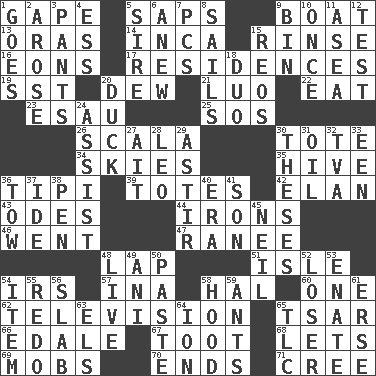 ACROSS 1. Stare wonderingly 5. Plant excrements 9. Water vessel 13. Mouths or openings 14. South American Indian 15. Remove soap 16. Immeasurably long periods of time 17. Homes 19. Fast jet (abbr.) 20. Morning condensation 21. Nilotic language 22. Ingest 23. Son of Isaac 25. Distress signal 26. Any of the three canals of the cochlea 30. Lug 34. Atmospheres 35. Hub of activity 36. Native american tent (variation) 39. Hauls 42. Liveliness 43. Lyric poems 44. Removes the wrinkles 46. Gone 47. Indian princess (variant) 48. Infant locale 51. Capri or Wight 54. Big collection agency 57. _ tizzy (2 wds.) 58. Actor Linden 60. Single 62. Boob tube 65. Russian ruler of old 66. Peak District village in England 67. A blast of a horn 68. Allows 69. Crowds into 70. Conclusions 71. Algonquian DOWN 1. Leaves 2. Came up 3. Leg coverings 4. Curvy letter 5. Male parent of an animal 6. Afresh 7. Personal Computers (abbr.) 8. Moves on water 9. Storage container 10. Single time 11. At sea 12. Trial 15. Vintage cars 18. Superhero pair 20. Evade 24. Aid 27. Small island 28. Lion 29. Having gotten out of bed 30. College papers 31. Lubricate 32. Federal power corp. 33. Car or cant ending 36. Pull behind 37. Binary compound 38. Animal enclosure 40. Period 41. Boy, to dad 45. Famous astronaut Armstrong 48. Not recorded 49. Black tropical American cuckoo 50. Thick mixture 52. Failure 53. Related on the mother's side 54. A whole individual unit 55. Redecorate 56. Thick slice 58. Parka part 59. Pismires 61. Celtic language 63. Raised railways 64. Electrically charged atom 65. Affectionate concern, for short