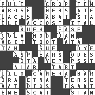 ACROSS 1. Whimper 5. Riding implement 9. "___ Little Indians" 12. Came up 14. Possessive pronoun 15. Had dinner 16. Shoestrings 17. Blind as ____ 18. R.R. building 19. Connecticut Ivy Leaguer 20. Buttonhole 23. Slanted text style (abbr.) 24. Malaysian steamed pastry 25. Relaxation 27. Root beer relative 30. Allow head to fall sleepily 32. One of the 12 tribes of Israel 33. "This won't hurt ____!" 34. A blast of a horn 36. _ moment's notice (2 wds.) 38. Scottish cap 39. Take to court 40. Color 43. Cleo's killer 46. Hearing organs 48. Lyric poems 49. Call ___ day 51. Slangy assent 52. Inconspicuous attention getter 53. Having or resembling wings 54. Small pie 56. _ and Stitch 58. Device for capturing images 61. Long, evenly shaped piece 64. Lyricist Gershwin 65. Inactive volcano in Sicily 66. Laconic 68. Large container 69. "Vaya con ____" 70. 1973 Nobel Price Winner (Physics) Leo 71. Compass dir. 72. Scram! 73. Comedian Laurel of Laurel & Hardy DOWN 1. Diluted with white 2. Mountain range 3. Locales 4. Compass dir. 5. US Secretary of Labor Elaine L. _ 6. Confederate soldiers (slang) 7. Spoke pompously 8. Pacific Standard Time (abbr.) 9. Clothes sense 10. Singer James 11. Be tempered by heat 13. Son of Isaac 21. Penny 22. Opt 23. Is not 24. Krazy ___ of comics 26. American Automobile Association (abbr.) 27. Feline 28. Chief or king in Benin or Nigeria 29. Pale green bean 31. A city in N France, SE of Calais 35. Cylindrical with tapered ends 37. Does sums 41. Affirmative reply 42. Eastern Standard Time (abbr.) 44. Grain storage tower 45. Parent Teacher Assoc. 47. Practice fight 48. Elect 50. Northern region 53. Having winglike extensions 55. Pace 56. Moving, as bait 57. SW Asia republic 59. Small Philippine buffalo 60. Vertical spar for supporting sails 61. Naughty child 62. "____ silly question..." 63. It's straight from the horse's mouth 65. Begley and Asner 67. Curvy letter