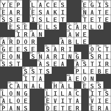 ACROSS 1. Slangy assent 4. Shoestrings 9. The front part of a cuirass 13. Hearing organ 14. 1973 Nobel Price Winner (Physics) Leo 15. Nathan's nickname 16. Compass dir. 17. Small island 18. False hair 19. Compass dir. 21. Raised railways 22. Monte _, Las Vegas Hotel/Casino 24. SW Asia republic 26. Deep reverence 27. Zeal 29. Competent 30. Honkers 31. Indian skirt 33. Sep. follower 36. Period of immesurable duration 37. Catching in a trap 40. _ Lanka 41. Fast jet (abbr.) 42. At sea 43. Moving or stirring 45. Fast planes 47. Cadet 48. Call ___ day 49. Period of immesurable duration 50. Lessep's creation 52. Actor Linden 54. Curvy letter 56. Yearn 57. Pale purple color 59. It is 61. Medicinal plant 62. Webber/Rice musical 63. Compete 64. Zero-star reviews 65. Prevent from occurring 66. Period DOWN 1. It is so 2. Relaxation 3. Elected leader of a country 4. Luau accessory 5. NE Netherlands city 6. Give a ring to 7. Supplements with great effort 8. Be seated 9. Main course 10. Highlander 11. "Tell ____ the Marines!" 12. Perceive with the eye 20. Greek god of love 22. Small house or cottage 23. Leather borer 25. Ancient Greek god of war 27. Matures 28. Vintage cars 29. Operatic vocal solo 31. Backtalk 32. "We ___ not amused" (Victoria) 33. Clearly or manifestly demonstrative 34. Baby bed with high sides 35. Hoop that covers a wheel 38. Relating to or accompanying birth 39. Open wide 44. _ gin 45. Burns superficially 46. R.R. building 49. Having winglike extensions 50. Root beer relative 51. At once, immediately (arch.) 52. Hub of activity 53. Came down and settled, as after flight 55. Move through with a circular motion 56. Infant locale 57. Directed 58. Auto 60. Ocean