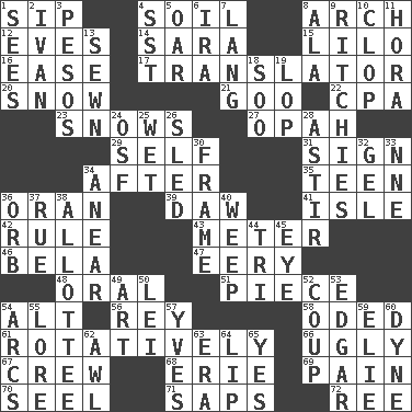 ACROSS 1. Small drink 4. Land 8. Bowlike part 12. Nights before holidays 14. "Two Mules for Sister ____" 15. _ and Stitch 16. Relaxation 17. Interpreter 20. Frozen precipitation 21. Thick or sticky substance 22. Numbers guy (abbr.) 23. Frozen precipitation (plural) 27. Brightly colored fish 29. Oneself 31. Signal 34. Following 35. Adolescent 36. Northwest Algerian city 39. Fool 41. Small island 42. Court order 43. Distance measurement 46. Actor Lugosi 47. Suggestive of the supernatural 48. Of the mouth 51. Component 54. The first octave above the treble staff 56. Marina Del _, California 58. Wrote a lyric poem 61. Producing rotation 66. Repulsive 67. Group working together 68. 4th largest of the Great Lakes 69. Ache 70. Sew up the eyelids of hawks and falcons 71. Plant excrements 72. To riddle DOWN 1. Perceives with the eye 2. _ the terrible 3. Mexican monetary units 4. Fast jet (abbr.) 5. Rowing implement 6. Retirement account (abbr.) 7. Austrian-born American filmmaker Fritz 8. Wing 9. Actors Guy, Robert Welles, and Clint 10. Hoof sound 11. Israeli folk dance 13. Stitched 18. "Barney Miller" actor Jack 19. Chop off 24. Order of Saint Francis (abbr.) 25. Dripping 26. Downhill vehicle 28. Moving or stirring 30. Movie unit 32. Set 33. Compass dir. 34. Approach 36. Globe 37. Sorrow 38. One to whom something is allotted 40. Shed a tear 44. Three (prefix) 45. Sight organ 49. Nonscientific branch of learning 50. Flowery wreath 52. Overturn; upset 53. _ Allan Poe 54. Arches 55. Old wives' tales, e.g. 57. Jacques Cousteau's middle name 59. Writer Wiesel 60. Unit of force 62. Leather borer 63. Epoch 64. Mouth edge 65. Affirmative reply