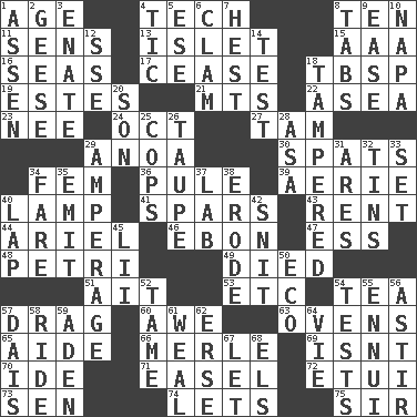 ACROSS 1. Grow older 4. Technical work 8. "___ Little Indians" 11. Elected reps. 13. Small island 15. Auto club (abbr.) 16. Oceans 17. Desist 18. Cook's measure (abbr.) 19. _____ Park, CO 21. Mountains (abbr.) 22. Toward the sea 23. Born 24. Sep. follower 27. Scottish cap 29. Small Philippine buffalo 30. Arguments over trivial matters 34. Opposite of masc. 36. Whimper 39. Nest on high 40. Desk light 41. Practice fights 43. Monthly bill 44. Satellite of Uranus 46. Inky black, to poets 47. Curvy letter 48. _ dish (used to culture cells) 49. Passed on 51. Small island 53. And so on (abbr.) 54. Afternoon social gathering 57. To be drawn or hauled along 60. Deep reverence 63. Baking chambers 65. Assistant 66. Haggard of country music 69. Is not 70. Binary compound 71. Artist's stand 72. Needle case 73. Elected rep. 74. Allows 75. Title for a knight DOWN 1. NE Netherlands city 2. Honkers 3. Related on the mother's side 4. Nervous spasm 5. Compass dir. 6. Burrowing marine mollusk 7. Behest 8. Bar bills 9. Comfort 10. California wine valley 12. Compass dir. 14. Trial 18. ________ with (broke a safety seal) 20. Boy, to dad 25. 911 reaches them 26. Grayish beige 28. White ___ sheet 29. Electrical Measurement 31. Ancient Greek god of war 32. Metal containers 33. Put into a specified state 34. Conductor's collection 35. Send forth 37. Experiment locale 38. Wear away 40. Pet locale 42. In a ____ (agitated or irritated) 45. Cards in a Roman deck? 50. Environmental prefix 52. Docile 54. Trials 55. World-weariness 56. Moving about 57. Raised platform 58. Travel on or in a vehicle 59. Arabian gulf 61. Welt 62. Celtic language 64. Compete 67. Allow 68. Raised railways