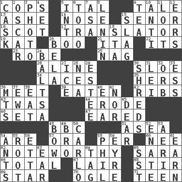 ACROSS 1. 911 reaches them 5. Slanted text style (abbr.) 9. Falsehood 13. American tennis player Robert 14. Sense of smell 15. Sir (Sp.) 16. Native of Scotland 17. Interpreter 19. Krazy ___ of comics 20. Oct. 31 cry 21. Call ___ day 22. ___ a Wonderful Life 23. Loose flowing garment 25. Tired old horse 26. Place in a line 30. _ gin 34. Shoestrings 35. Possessive pronoun 36. Confront 39. Eroded 42. Chest bones 43. It was, poetically 44. Wear away 46. Stalk of a moss capsule 47. Having ears or earlike features 48. English channel? 51. At sea 54. "We ___ not amused" (Victoria) 57. Mouth or opening 58. For each 60. Born 62. Music shop? 65. "Two Mules for Sister ____" 66. Add up to 67. Den 68. Tumult 69. Play the lead 70. Stare 71. Adolescent DOWN 1. Keg 2. Motion picture award 3. Picture 4. Arrange properly for use 5. To the inside or interior of 6. "Corrida" creature 7. White ___ sheet 8. Soviet premier 1918-24 9. Afternoon social gathering 10. Opposed to 11. Plunder 12. Blunders 15. Volcanic refuse 18. R.R. building 20. Actor Lugosi 24. Greek mezzo-soprano Agnes 27. Frozen water 28. Teachers' org. 29. First name in cosmetics 30. Fragments 31. Flowery wreath 32. Globe 33. Curvy letter 36. Mountains (abbr.) 37. She-sheep 38. Consume 40. Epoch 41. And not 45. Letter starter 48. Soup holder 49. Sis' sibling 50. Monte _, Las Vegas Hotel/Casino 52. Related on the mother's side 53. Nest on high 54. Pismires 55. Carrot, for example 56. Singer James 58. Silvers or Donahue 59. Jane of fiction 61. Merit 63. Ewer handle 64. Label 65. Fast jet (abbr.)