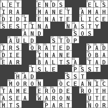 ACROSS 1. Allow 4. Conclusions 8. Raised railways 11. Lyricist Gershwin 12. French painter Edouard 14. Wet nurse 15. "You Light Up My Life" star Conn 17. Related on the mother's side 18. Louse (plural) 19. French poetic form 21. Difficult 23. Plus 24. Distress signal 25. Old (Scot.) 27. Constrict 30. Big collection agency 31. Spoke pompously 34. Groovy apt. 37. Expire 38. Silly 39. Chief or king in Benin or Nigeria 40. Hearing organ 41. Greek mezzo-soprano Agnes 43. Bit 44. Small island 45. Inconspicuous attention getter 47. Possessed 49. Fast jet (abbr.) 50. Person of subnormal intelligence 52. Pertaining to the sea 56. Docile 57. Eat (away) 60. Writer of Portnoy's Complaint (1969) 61. Toward the sea 62. Make _____ (do battle with) 63. Shoshoni 64. Mountains (abbr.) 65. Piece 66. Not either DOWN 1. Hats (slang) 2. 4th largest of the Great Lakes 3. Bits 4. Make improvements or corrections to 5. Grandmother 6. Heredity factor (abbr.) 7. Put into a specified state 8. Gives off 9. Made of lace 10. A female animal or person 13. Nine, plus one 14. In addition 16. Slanted text style (abbr.) 20. _ china 22. Viper 25. Roberta Peters solo 26. One who uses or employs something 27. Lacking originality or spontaneity 28. Portable shelter 29. Lyric poems 30. Binary compound 32. Teases 33. Of or related to the anus 34. Cooking vessels 35. Blind as ____ 36. June honoree 42. Domed church section 44. Wedding promise 46. Play the lead 47. Dwellings 48. Type of rug 49. Aroma 50. Vertical spar for supporting sails 51. ___ Haven, CT 52. Aroma 53. Part of speech 54. "Tell ____ the Marines!" 55. "Mermaids" star 56. Scottish cap 58. Hit sharply and swiftly 59. Mouth or opening