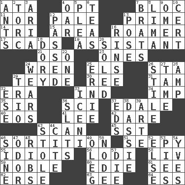 ACROSS 1. "One Day ___ Time" 4. Elect 7. Coalition 11. And not 12. Diluted with white 13. First class 14. Three (prefix) 15. Type of rug 16. Wanderer 17. Large numbers or amounts 19. Helper 21. Bear (Spanish) 23. Singles 24. Songbird 25. Raised railways 26. R.R. building 29. Miss Universe 1986, Barbara Palacios _ 30. To separate or throw off 31. Scottish cap 32. Period 33. Working for oneself (abbr.) 34. Naughty child 35. Title for a knight 36. _-fi 37. Peak District village in England 40. Greek goddess of the dawn 41. Area sheltered from the wind 42. Have the gumption 43. Glance over 45. Fast jet (abbr.) 46. Conclusion 51. Oozy 55. Foolish or stupid persons 56. Farming town in central California 58. 54 in ancient Rome 59. Impressive in appearance 60. Singer Brickell 61. Observe 62. Celtic language 63. Turn to the right 64. Double-curved letter DOWN 1. Pismires 2. Torque (variant) 3. Roberta Peters solo 4. Rowing implement 5. Entreaty 6. Afternoon social gatherings 7. Naughty children 8. Pale green bean 9. Sign of something about to happen 10. An absolute certainty 12. Went by 13. Airs 16. Remove soap 18. Small, narrow, flatbottom fishing boat 20. Having a sole or soles 22. Single 24. Erodes 25. Bert's buddy 26. Vertical member of a panel or frame 27. Docile 28. Electrical Unit 29. Musical group of three 32. Compass dir. 33. Ancient Celtic tribe of eastern Britain 36. Narrow boards 37. Begley and Asner 38. Small ungulate mammals of Africa 39. Johnson of "Laugh-In" 43. Took without asking 44. Quote 46. Trig term 47. Aroma 48. Teases 49. Cassini of fashion 50. Thickened enlargement 52. Otherwise 53. Sliced desserts 54. Jacques Cousteau's middle name 57. Pass on