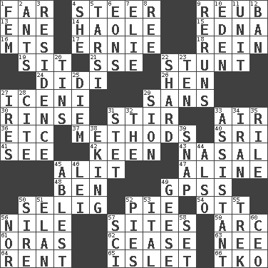 ACROSS 1. Distant 4. Bull 9. Reuben's nickname 13. Compass dir. 14. White Person, in Hawaii 15. Pulitzer Prize-winning author Ferber 16. Mountains (abbr.) 17. Bert's buddy 18. It's straight from the horse's mouth 19. Be seated 21. Compass dir. 22. Difficult or unusual or dangerous feat 24. "You Light Up My Life" star Conn 26. Layer 27. Ancient Celtic tribe of eastern Britain 29. Without 30. Remove soap 31. Disorderly outburst 33. Atmosphere 36. And so on (abbr.) 37. Modes 40. Indian title of respect (Mr.) 41. Observe 42. Peachy ____! 43. Relating to the nose 45. Set down 47. Place in a line 48. Benjamin's nick name 49. Global Positioning Systems (abbr.) 50. Major League Baseball Commissioner Bud 52. Sliced dessert 54. Baseball player Mel 56. "Death on the ____" 57. Settings 59. Curve 61. Mouths or openings 62. Desist 63. Born 64. Monthly bill 65. Small island 66. Ring climax DOWN 1. Opposite of masc. 2. Pismires 3. Dwelling 4. A female animal or person 5. Tarsus (plural) 6. Immeasurably long periods of time 7. Writer Wiesel 8. To riddle 9. Summer TV shows 10. Locale of original sin 11. A single undivided whole 12. Prohibit 20. Airtight sealed metal containers 22. Broken piece 23. Nine, plus one 25. South Vietnam president (1954) 27. Angers 28. Quote 29. The Jewish people; Israel 31. Proofreading order 32. Definite Article 33. Aide 34. SW Asia republic 35. Cause heat under the collar 38. Supplementing with great effort 39. Fastener 44. In addition 45. Most capable 46. Flowery wreath 49. Honkers 50. Title for a man of rank and authority 51. Enthusiasm 52. Sliced desserts 53. Slanted text style (abbr.) 55. Long journey 56. Not either 57. _-fi 58. Put into a specified state 60. Corporate head (abbr.)