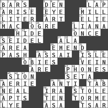 ACROSS 1. Long, evenly shaped pieces 5. Lair 8. Pet locale 11. Ascend 13. Sight organ 14. Place where flour is made 15. 61 cubic inches 16. Tate display 17. Writer Wiesel 18. Big _ 19. Legendary monster 21. Climbing, woody, usually tropical vines 22. Flintstone garb 24. Single time 25. Beer mug 27. According to 29. Type of rug 30. Make improvements or corrections to 32. Romantic infatuation 33. Slender Brazilian palm 35. Small island 39. Off-Broadway awards 41. Distinctive style or manner 42. "We ___ not amused" (Victoria) 43. Gives a jingle 45. The Jewish people; Israel 48. Stalk of a moss capsule 49. Nest on high 50. Opposed to 52. Bar bill 55. Be tempered by heat 56. Retirement account (abbr.) 57. Took without asking 59. Flats, for short 60. "___ Little Indians" 61. Singer Mel 62. Potassium hydroxide 63. White ___ sheet 64. Russian ruler of old DOWN 1. Lip ointment 2. Roberta Peters solo 3. Actors Guy, Robert Welles, and Clint 4. Compass dir. 5. Letter starter 6. Jane of fiction 7. Fish or hair follower 8. Pale purple color 9. Place in a line 10. Entreaty 12. Wear away 14. Chow _ 20. Set 21. Grant temporary use of 23. Potato state 25. Plant excrement 26. Period 27. Wet nurse (var.) 28. Luau accessory 30. Double-curved letter 31. A piece of turf (Scot.) 33. Atmosphere 34. Perceive with the eye 36. Elected representatives 37. Whopper 38. Followers of ems 40. Object of repulsion 43. Pacific Standard Time (abbr.) 44. Robbery 45. Oozy 46. Feeling or showing extreme anger 47. Lubricates 49. Of or related to the anus 50. Ancient Greek god of war 51. Nanny 53. _ mater 54. Fermented drink made from hops 56. Call ___ day 58. Small child