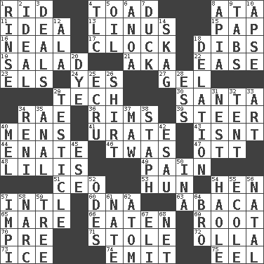 ACROSS 1. To free from 4. Frog relative 8. "One Day ___ Time" 11. It may be bright or harebrained 13. "_ and Lucy" (Charlie Brown theme song) 15. Infant food 16. Anneal 17. Timepiece 18. Rights 19. First course 21. Alias (abbr.) 22. Comfort 23. Raised railways 24. It is so 27. Set 29. Georgia ____ (Atlanta school) 30. Before Barbara or Clara 34. Actress Charlotte 36. Basketball hoops 39. Guide 40. Not women's 41. A salt of uric acid 43. Is not 44. Related on the mother's side 46. It was, poetically 47. Baseball player Mel 48. Ms. Damita and namesakes 49. Ache 51. Corporate head (abbr.) 53. Attila the _ 54. Layer 57. International (abbr.) 60. Heredity factor (abbr.) 63. Phillipine bananalike plant 65. Female horse 66. Consumed 69. Carrot, for example 70. Before (prefix) 71. Took without asking 72. Water jar 73. Frozen water 74. Give off 75. Snakelike fish DOWN 1. Remove soap 2. Perfect 3. Allots cards 4. Affectionate concern, for short 5. Petroleum 6. Small Philippine buffalo 7. Evade 8. Capital of Western Samoa 9. Bar bills 10. Domed church section 12. According to 14. Heroin 18. Accusation by an informer 20. Color 25. Shade of tan 26. Upper-body garment 28. Curvy letter 29. A testis 31. Egg locale 32. Portable shelter 33. Nonscientific branch of learning 34. Painter Guido (1575-1642) 35. Of or related to the anus 37. Informal term for the mouth 38. Staphylococcus 40. Cartoonist voice _ Blanc 42. He sold his birthright 45. Compass dir. 50. _ tizzy (2 wds.) 52. Lyric poems 54. White Person, in Hawaii 55. Learning spot: Fr. 56. Relating to or accompanying birth 57. Body of Kaffir warriors 58. Drug cop 59. Relationship diagram 61. Nathan's nickname 62. Tiny particle 64. Sis' sibling 67. Connecticut Ivy Leaguer 68. Fish or hair follower