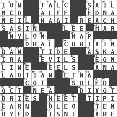 ACROSS 1. Electrically charged atom 4. Baby powder 8. Move on water 12. Non-commissioned officer (abbr.) 13. Toward shelter 14. Pulitzer Prize-winning author Ferber 15. Famous astronaut Armstrong 17. Wise men 18. Arrive at 19. Indian antelope 21. Area sheltered from the wind 23. Spoil 24. Thermoplastic polyamide 26. Atlas unit 28. Relating to the mouth 30. Window treatment 34. One of the 12 tribes of Israel 37. Periodic rise and fall of the sea level 39. "____ silly question..." 40. Lyricist Gershwin 41. Vices 43. Period of immesurable duration 44. Actor's bit 46. Snakelike fish 47. Santa ___, CA 48. Of or relating to Laos or its people 51. Inactive volcano in Sicily 54. Small bed 55. Having a sole or soles 58. Sep. follower 61. Teachers' org. 63. A piece of turf (Scot.) 65. Frees from moisture 67. Rendezvous 71. Native american tent (variation) 72. Merit 73. Butter sub 74. Nine, plus one 75. Colored 76. Is not 77. "We ___ not amused" (Victoria) DOWN 1. Restaurants 2. Sea 3. Annoyingly loud 4. Scottish cap 5. Chicken ___ king 6. Part of a journey 7. To provide with a ceiling 8. Observe 9. First of billions? 10. South American Indian 11. Cowardly lion portrayer 16. _ and Stitch 18. Hitchcock's "____ Window" 20. And not 22. Australian flightless bird 25. Nathan's nickname 27. Parent Teacher Association (abbr.) 29. Make or become more lively 30. Cell (Danish) 31. Toward the sea 32. Image 33. Grandmother 34. Deli pickle 35. Roberta Peters solo 36. Billionth: prefix 38. Pass on 42. Fast planes 45. And so on (abbr.) 49. Charged particles 50. Had dinner 52. Allow head to fall sleepily 53. Came down and settled, as after flight 56. Webber/Rice musical 57. Drug addict 58. Wrote a lyric poem 59. Supercomputer manufacturer 60. Hoop that covers a wheel 62. Mine, in Marseilles 64. Prong on a fork 66. Conclusion 68. Raised railways 69. Car or cant ending 70. Small child