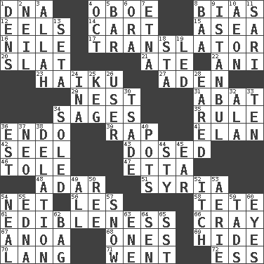 ACROSS 1. Heredity factor (abbr.) 4. Mitch Miller's instrument 8. Prejudice 12. Snakelike fish 14. Heavy open wagon 15. At sea 16. The longest river in the world 17. Interpreter 20. Narrow board 21. Had dinner 22. Cuckoo 23. Japanese poetic form 27. An important port of Yemen 29. Egg locale 31. Blind as ____ 34. Gurus 35. General guideline 36. Inside; within (prefix) 39. Reproach for some lapse or misdeed 41. Enthusiasm 42. Sew up the eyelids of hawks and falcons 43. Administered medicine 46. Lacquered or enameled metalware 47. Singer James 48. The sixth month of the Jewish calendar 51. Damascus' land 54. Fish or hair follower 56. French article 58. Wig 61. The property of being fit to eat 66. Supercomputer manufacturer 67. Small Philippine buffalo 68. Singles 69. Flintstone garb 70. Austrian-born American filmmaker Fritz 71. Left 72. Double-curved letter DOWN 1. Lairs 2. Famous astronaut Armstrong 3. Assad's deity 4. Sep. follower 5. Tavern 6. Mouth or opening 7. Inactive volcano in Sicily 8. Sound made by sheep 9. Byzantium, centuries later 10. Period of immesurable duration 11. Indian skirt 13. Bristle 18. R.R. building 19. Directed 24. _ tizzy (2 wds.) 25. Cask 26. One who uses or employs something 28. Having ears or earlike features 30. Sadhe (variant) 32. According to 33. "___ Little Indians" 34. Having a sole or soles 36. Eastern Standard Time (abbr.) 37. Modern: prefix 38. Conveyance 40. Plant holders 44. Filthy place 45. Hearing organ 49. Everything 50. To sift 52. Hankering 53. Nest on high 54. Actress Patricia 55. Pulitzer Prize-winning author Ferber 57. Overwhelm 59. Small boys 60. Sight organs 62. Container for groceries 63. Compass dir. 64. Elected rep. 65. Fast jet (abbr.)