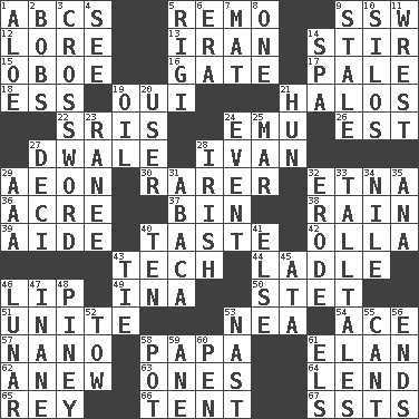 ACROSS 1. Lettered men learn these first 5. San ____ (Riviera town) 9. Compass dir. 12. Old wives' tales, e.g. 13. SW Asia republic 14. Use a swizzle stick 15. Mitch Miller's instrument 16. Yard entry 17. Diluted with white 18. Double-curved letter 19. Fr. "Yes" 21. Rings 22. Indian titles of respect 24. Australian flightless bird 26. Eastern Standard Time (abbr.) 27. A sleeping potion; an opiate (poet.) 28. "Terrible" tsar 29. Period of immesurable duration 30. More valued for its uncommonness 32. Inactive volcano in Sicily 36. 1/640 square mile 37. Storage container 38. Water falling in drops from the sky 39. Helper 40. Clothes sense 42. Water jar 43. Technology 44. Dipping utensil 46. Mouth edge 49. _ tizzy (2 wds.) 50. Proofreading order 51. Join together 53. Teachers' org. 54. Adept person 57. Billionth: prefix 58. Dad 61. Liveliness 62. Afresh 63. Washington bills 64. Grant temporary use of 65. Marina Del _, California 66. Portable shelter 67. Fast planes DOWN 1. Medicinal plant 2. Moves up and down 3. What you're doing now 4. Perceive with the eye 5. Swiss mountan, "Queen of the Mountains" 6. Epoch 7. Floor protector 8. Single 9. Having lost freshness 10. Grain storage towers 11. Take or capture by force 14. Health resort 19. Petroleum 20. One who makes use of a thing 21. Attila the _ 23. Indian princess (variant) 24. Happening 25. Spoil 27. Tenth: prefix 28. From or relating to Ireland 29. American Automobile Association (abbr.) 31. Phillipine bananalike plant 32. Wear away 33. Baron Munchausen's specialties 34. Mediterranean tributary 35. Santa ___, CA 40. Nine, plus one 41. Otherwise 43. Neckwear 45. _ moment's notice (2 wds.) 46. Type of eclipse 47. Empty; void 48. Abounding in pines 52. Pull behind 53. Political cartoonist Thomas 55. Patter 56. Extremities 58. Cooking vessel 59. A saturated hydrocarbon 60. Animal enclosure 61. Raised railways