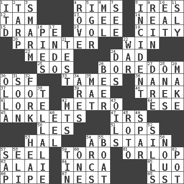 ACROSS 1. It is 4. Basketball hoops 8. Angers 12. Scottish cap 13. Double curve, resembling the letter S 14. Be tempered by heat 15. Window treatment 18. Grand slam 19. Municipality 20. Hard copy producer 22. Acquire through effort 23. Ancient Persian 24. June honoree 25. Distress signal 26. Mood resulting from idleness 30. Order of Saint Francis (abbr.) 33. Makes less strong or intense 36. Grandmother 37. Spoils 39. Actress Charlotte 40. Long journey 41. Old wives' tales, e.g. 42. Paris' subway 44. Compass dir. 45. Short socks 47. Big collection agency 50. French article 51. Chops off 53. Actor Linden 54. Refrain by choice 57. Stitch closed the eyes of (a falcon) 59. "Corrida" creature 61. Fourth or lowest deck 63. Jai _ 64. South American Indian 65. Nilotic language 66. Corncob 67. A home for chicks 68. Fast jet (abbr.) DOWN 1. It would 2. Canvas cover 3. Excessive but superficial compliments 4. Be footloose 5. Russian composer Stravinsky 6. Cartoonist voice _ Blanc 7. Observe 8. Event 9. It's straight from the horse's mouth 10. Ingest 11. Insidious 16. Sliced desserts 17. Inside; within (prefix) 21. Trial 22. Armed conflict 24. Two (Sp.) 26. Fermented drink made from hops 27. Have the gumption 28. Washington bills 29. Cause to be 30. Rounded earthenware pot or jar 31. Within a short period 32. Tined utensil 34. Ancient Greek god of war 35. Floor protector 38. Copy Pinocchio 42. Mountains (abbr.) 43. Lubricates 46. Snakelike fish 48. Printing process, for short 49. Practice fight 52. Beverly of Met fame 53. Pile 54. Curves 55. Water vessel 56. Common sense 57. Plant excrement 58. Biblical high priest 59. Shallow baking pan 60. Single 62. Plant holder