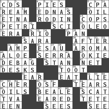 ACROSS 1. Music discs 4. Sliced desserts 8. Tax preparer (abbr.) 11. 480, 500 or 516 sheets of paper 13. Ferber et al. 15. Lubricate 16. Inactive volcano in Sicily 17. "The Thinker" sculptor 18. 911 reaches them 19. _ dish (used to culture cells) 21. _-fi 22. Margarine 23. Epoch 24. _ de Janeiro 27. Baking dish 29. "Two Mules for Sister ____" 30. Following 34. Electrical Unit 36. Son of Isaac 39. Scent 40. _ vera 41. Father Junipero _ 43. Migrant worker of the '30s 44. Debunk (Brit. slang) 46. Comedian Laurel of Laurel & Hardy 47. Remaining after all deductions 48. Writing tables 49. A blast of a horn 51. Ewer handle 53. Consume 54. Falsehood 57. "Mermaids" star 60. Order of Saint Francis (abbr.) 63. Lacerates 65. Petroleums 66. Memphis, Tenn. Street 69. Jazz singing style 70. Federal power corp. 71. Having ears or earlike features 72. False hair 73. Car or cant ending 74. Observes 75. Observe DOWN 1. Streamer paper 2. Prevent from occurring 3. Before Barbara or Clara 4. For each 5. Wedding promise 6. Conclusions 7. Ketch in the Levant 8. Calm and collected 9. Corncob 10. In addition 12. Spoil 14. Sever or remove by pinching or nipping 18. Meet 20. Lyricist Gershwin 25. Angers 26. Fertile tracts in a desert 28. American Automobile Association (abbr.) 29. Orators 31. Puff or smoke 32. Give off 33. Actress Charlotte 34. Toward shelter 35. Disorderly crowds 37. Nonscientific branch of learning 38. A salt of uric acid 40. Find the sum of 42. Small Philippine buffalo 45. Girls' org. (abbr.) 50. Baseball player Mel 52. Loose flowing garment 54. Shoestrings 55. Feeling or showing extreme anger 56. First name in cosmetics 57. ____ d'Azur (French Riviera) 58. Hub of activity 59. Liveliness 61. Oceans 62. Conductor's collection 64. Eastern Standard Time (abbr.) 67. Area sheltered from the wind 68. Begley and Asner