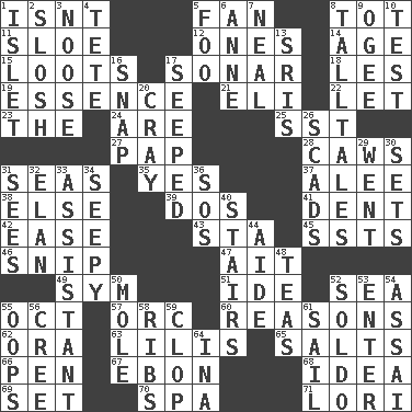 ACROSS 1. Is not 5. Avid follower 8. Small child 11. A type of plum 12. Singles 14. Mature 15. Plunders 17. Echolocation 18. French article 19. Center 21. Biblical high priest 22. Allow 23. Definite Article 24. "We ___ not amused" (Victoria) 25. Fast jet (abbr.) 27. Infant food 28. Crow sounds 31. Oceans 35. It is so 37. Toward shelter 38. Otherwise 39. Two (Sp.) 41. Undesirable depression on a surface 42. Relaxation 43. R.R. building 45. Fast planes 46. Sever or remove by pinching or nipping 47. Small island 49. Symbol (abbr.) 51. Binary compound 52. Ocean 55. Sep. follower 57. The grampus (Milton) 60. Thinks logically 62. Mouth or opening 63. Ms. Damita and namesakes 65. Table seasonings 66. Animal enclosure 67. Inky black, to poets 68. It may be bright or harebrained 69. Put into a specified state 70. Health resort 71. Australian parrot (variant) DOWN 1. Small island 2. Agitate, as a liquid 3. Trap for birds or small mammals 4. Wig 5. Egg _ yung 6. Queen of England 1702-14 7. Be tempered by heat 8. Baron Munchausen's specialties 9. Double curve, resembling the letter S 10. Trial 13. Indian titles of respect 16. Fastener 17. Oozed 20. Supercomputer manufacturer 26. Oodles 29. Gone 30. Puts into a specified state 31. Observes 32. Flair 33. Helper 34. Oozy 36. Mayday 40. Flight of steps 44. Helper 48. Beverages made from leaves 50. Undercover agent 52. Twentieth part of a lira 53. Keyboard key 54. Slender Brazilian palm 55. I made a mistake 56. Algonquian 58. Chest bones 59. Hoof sound 61. Travel by water 64. _ tizzy (2 wds.)