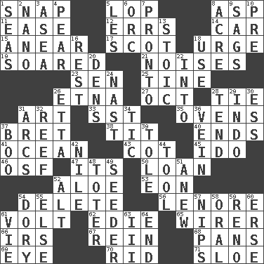 ACROSS 1. Fastener 5. Chop off 8. Viper 11. Comfort 12. Blunders 14. 4-wheeled motor vehicle 15. Approach 17. Highlander 18. Goad 19. Flew 21. Annoying sounds 23. Elected rep. 25. Prong on a fork 26. Inactive volcano in Sicily 27. Sep. follower 28. Standoff 31. Nonscientific branch of learning 33. Fast jet (abbr.) 35. Baking chambers 37. Cy Young winner Saberhagen 38. Teat (slang) 40. Extremities 41. Sea 43. Small bed 45. Wedding promise 46. Order of Saint Francis (abbr.) 47. ___ a Wonderful Life 50. Grant temporary use of 52. Medicinal plant 53. Period of immesurable duration 54. Erase 56. Poe poem 61. Electrical Unit 62. Singer Brickell 65. One who wires 66. Big collection agency 67. It's straight from the horse's mouth 68. Baking dishes 69. Sight organ 70. To free from 71. _ gin DOWN 1. Oceans 2. Billionth: prefix 3. Toward the sea 4. Lightbulb-shaped fruit 5. French article 6. The grampus (Milton) 7. Right away 8. Measure of real estate 9. Settles 10. Before (prefix) 13. Unemotional 16. Take ten 18. Purpose 20. Hiding places for outlaws 22. To the inside or interior of 24. Political cartoonist Thomas 26. Singer James 28. Watch over 29. _ china 30. Double-curved letter 31. Arches 32. Coral collection 34. Nervous spasm 36. Distinctive style or manner 37. Sometimes accompanies a hiss 39. Lacquered or enameled metalware 42. Mediterranean tributary 44. Instrument 48. Carrier 49. Sowing specialist 51. Afresh 52. The first octave above the treble staff 54. Dinghy 55. Otherwise 57. Cuts off 58. Of the mouth 59. Western Nevada city 60. Celtic language 61. Compete 63. One more than two 64. Conclude