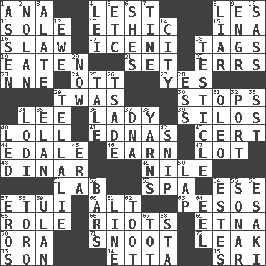 ACROSS 1. Santa ___, CA 4. For fear that 8. French article 11. Flatfish 13. Principle of right and wrong 15. _ tizzy (2 wds.) 16. Cole _ (cabbage dish) 17. Ancient Celtic tribe of eastern Britain 18. Labels 19. Consumed 21. Put into a specified state 22. Blunders 23. Compass dir. 24. Baseball player Mel 27. It is so 29. It was, poetically 30. Ceases 34. Area sheltered from the wind 36. Kenny Rogers chart-topper in '80 39. Grain storage towers 40. Hang loosely or laxly 41. Ferber et al. 43. Certainty 44. Peak District village in England 46. Merit 47. Car dealer's back yard 48. Middle Eastern gold or silver currency 49. Mediterranean tributary 51. Experiment locale 53. Health resort 54. Compass dir. 57. Needle case 60. The first octave above the treble staff 63. Mexican monetary units 65. Hero or heavy, e.g. 66. Debaucheries 69. Inactive volcano in Sicily 70. Mouth or opening 71. Snout, nose 72. Path through which fluid escapes 73. Male child 74. Singer James 75. Indian title of respect (Mr.) DOWN 1. NE Netherlands city 2. Pitcher Ryan 3. Having winglike extensions 4. Luau accessory 5. And so on (abbr.) 6. "______ My Girl" (Turtles hit) 7. Prong on a fork 8. One who doesn't tell the truth 9. Engineer (abbr.) 10. Backtalk 12. She-sheep 14. Municipality 18. One of the two male reproductive glands 20. At this time 25. Falsehood 26. Sadhe (variant) 28. Double-curved letter 29. Copy Pinocchio 31. Butter sub 32. Sweet dark-red dessert wine 33. Fast jet (abbr.) 34. Farming town in central California 35. Enthusiasm 37. Heredity factor (abbr.) 38. Entertaining tales 40. Directed 42. Sever or remove by pinching or nipping 45. Epoch 50. Pet locale 52. Drinking establishments 54. _____ Park, CO 55. Underwater navigation system 56. 1973 Nobel Price Winner (Physics) Leo 57. Greek god of love 58. "Corrida" creature 59. ____ Bator 61. Actor's bit 62. A blast of a horn 64. Snakelike fish 67. Small child 68. R.R. building