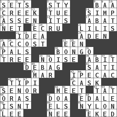 ACROSS 1. Arranges properly for use 5. Filthy place 8. Sound made by sheep 11. Small stream 13. Third day of the wk. 14. Simple or foolish person 15. NE Netherlands city 16. It is 17. Blind as ____ 18. Fish or hair follower 19. Shade of tan 21. Ms. Damita and namesakes 22. The main thing one is thinking about 24. Arabian gulf 25. Buttonhole 27. Car or cant ending 29. Friends 30. Beat drum 32. Woody plant 33. Annoying sound 35. "This won't hurt ____!" 39. Debunk (Brit. slang) 41. Suttee (variant) 42. Third mo. 43. Medicinal drug used to evoke vomiting 45. Native american tent (variation) 48. Keg 49. Sir (Sp.) 50. Confront 52. Make lace 55. Mouths or openings 56. ___ good deed 57. Peak District village in England 59. Is not 60. Raised railways 61. Thermoplastic polyamide 62. Area sheltered from the wind 63. Born 64. Supplemented with great effort DOWN 1. Skim 2. Celtic language 3. A testis 4. Perceive with the eye 5. Use a swizzle stick 6. Ballerina skirt 7. It is so 8. Instruction Manual for Humans 9. At full speed 10. Flats, for short 12. Leg joints 14. Alleged 20. Domesticated feline 21. Austrian-born American filmmaker Fritz 23. Administered medicine 25. Fitting 26. 4-wheeled motor vehicle 27. Greek goddess of the dawn 28. Compass dir. 30. Massive 31. Fertile tracts in a desert 33. Basketball assoc. 34. Rowing implement 36. Sass 37. Call ___ day 38. Nervous spasm 40. Independent ruler or chieftain 43. Frozen water 44. Eucharist need 45. Laconic 46. Lacking in sense or substance 47. Mail 49. Earth 50. Undercover agent 51. Comfort 53. _ vera 54. Look after 56. Lair 58. Color