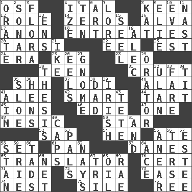 ACROSS 1. Order of Saint Francis (abbr.) 4. Slanted text style (abbr.) 8. Peachy ____! 12. Hero or heavy, e.g. 14. Nothings 16. Inventor's middle name 17. At once, immediately (arch.) 18. Pleas 20. Tarsus (plural) 22. Snakelike fish 23. Eastern Standard Time (abbr.) 24. Epoch 25. Cask 28. Lion 30. Adolescent 31. An unpleasant substance 35. Quiet! 37. Farming town in central California 40. Jai ____ 41. Toward shelter 42. Don Adams' spy role 44. Small pie 45. Charged atoms 46. Singer Brickell 47. Single 48. Mesonic 50. Play the lead 52. Plant excrement 54. Layer 55. Had dinner 58. Arrange properly for use 61. Baking dish 63. Natives or inhabitants of Denmark 65. Interpreter 70. Certainty 71. Assistant 72. Damascus' land 73. Relaxation 74. Egg locale 75. Drop; flow; fall 76. Portuguese money of account (variant) DOWN 1. Declaim 2. Echolocation 3. Plants 4. Ending with capital 5. "___ Little Indians" 6. Tate display 7. Old wives' tales, e.g. 8. Krazy ___ of comics 9. Writer Wiesel 10. Nights before holidays 11. Political cartoonist Thomas 13. Followers of ems 15. Stitch closed the eyes of (a falcon) 19. Actor Baldwin 21. Mamie's mate 26. Snakelike fish 27. Dwarf 29. Speaker 30. College paper 32. Uhlan (variant) 33. Conductor's collection 34. Teat (slang) 35. _ gin 36. Coop moms 38. June honoree 39. From or relating to Ireland 41. Direct toward a target or goal 43. False hair 49. Balmoral and tarboosh 51. Also 53. Friends 55. Approach 56. Laconic 57. First name in cosmetics 58. Comedian Laurel of Laurel & Hardy 59. 4th largest of the Great Lakes 60. Small amounts or degrees 62. Negative votes 64. Adept person 66. Remaining after all deductions 67. Three (prefix) 68. Lubricate 69. Actress Charlotte