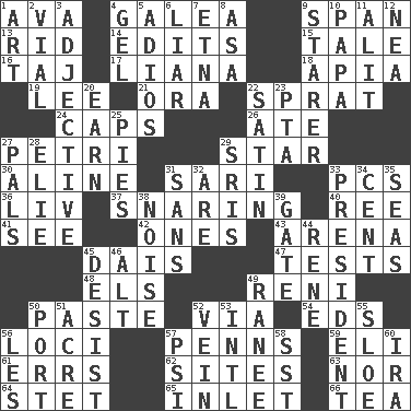 ACROSS 1. Actress Gardner 4. An organ shaped like a helmet 9. Connect, as a bridge 13. To free from 14. Prepares for publication 15. Falsehood 16. _ Mahal 17. Woody, climbing, usually tropical plant 18. Capital of Western Samoa 19. Area sheltered from the wind 21. Mouth or opening 22. Small fatty European fish 24. Balmoral and tarboosh 26. Had dinner 27. _ dish (used to culture cells) 29. Play the lead 30. Place in a line 31. Indian skirt 33. Personal Computers (abbr.) 36. 54 in ancient Rome 37. Catching in a trap 40. To separate or throw off 41. Observe 42. Singles 43. Sports stadium 45. Raised platform 47. Trials 48. Raised railways 49. Painter Guido (1575-1642) 50. Thick mixture 52. By way of 54. Begley and Asner 56. Locales 57. Actor Sean's family 59. Connecticut Ivy Leaguer 61. Blunders 62. Locates 63. Not either 64. Proofreading order 65. An arm off of a larger body of water 66. Afternoon social gathering DOWN 1. Tate display 2. Small bottle 3. Descriptive word 4. Set 5. Goodbye (Sp.) 6. One who doesn't tell the truth 7. Inactive volcano in Sicily 8. White ___ sheet 9. A viewer who gazes fixedly 10. Dad 11. Came down and settled, as after flight 12. Teachers' org. 20. Merit 22. Smooth fabric 23. Parent Teacher Assoc. 25. Sliced desserts 27. Friends 28. Writer Wiesel 29. Indian titles of respect 31. Without 32. "We ___ not amused" (Victoria) 33. Elected leader of a country 34. Penny 35. Oceans 38. Annoying sound 39. Yard entry 44. French philosopher Descartes 45. Stop 46. Keyboard modifier key 49. The wife of a rajah (variant) 50. Sweet dark-red dessert wine 51. Land measure 52. Distinctive style or manner 53. International (abbr.) 55. _ gin 56. French article 57. 23rd letter of the Greek alphabet 58. Fast jet (abbr.) 60. Retirement account (abbr.)