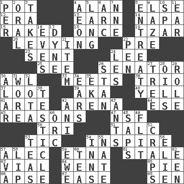 ACROSS 1. Cooking vessel 4. Actor Alda or Thicke 8. Otherwise 12. Period 13. Merit 14. California wine valley 15. Swept the length of 18. Single time 19. Russian ruler 20. Imposing or collecting, as a tax 22. Before (prefix) 23. Transmitted 24. Area sheltered from the wind 25. Perceive with the eye 26. Legislator 30. Leather borer 33. Confronts 36. Musical group of three 37. Plunder 39. Alias (abbr.) 40. Shout 41. Johnson of "Laugh-In" 42. Sports stadium 44. Compass dir. 45. Thinks logically 47. Science/research agcy. 50. Three (prefix) 51. Baby powder 53. Nervous spasm 54. Stimulate to action 57. Actor Baldwin 59. Inactive volcano in Sicily 61. Showing deterioration from age 63. Small bottle 64. Left 65. Sliced dessert 66. Domed church section 67. Relaxation 68. Elected rep. DOWN 1. For each 2. Taken by mouth 3. Receives possession of 4. Period of immesurable duration 5. Austrian-born American filmmaker Fritz 6. Curve 7. Compass dir. 8. Plea 9. Goldbrick 10. Health resort 11. Ewer handle 16. Nights before holidays 17. Unit of force 21. Detail 22. Writing instrument 24. French article 26. Comedian Laurel of Laurel & Hardy 27. Relationship diagram 28. Petroleums 29. Hero or heavy, e.g. 30. Having or resembling wings 31. Had on 32. Globular water bottle used in Asia 34. Hearing organs 35. Supplement with great effort 38. One of the two male reproductive glands 42. Cuckoo 43. Pismires 46. The grampus (Milton) 48. Plant excrements 49. Sudden quick movement 52. Dice game 53. Beverages made from leaves 54. Lodging establishments 55. Nathan's nickname 56. Writer Wiesel 57. Actress Gardner 58. Mouth edge 59. She-sheep 60. Beverage made from leaves 62. Car or cant ending