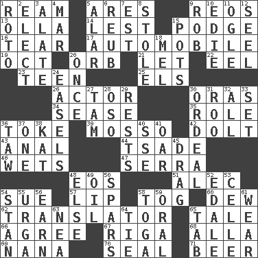 ACROSS 1. 480, 500 or 516 sheets of paper 5. Ancient Greek god of war 9. Vintage cars 13. Rounded earthenware pot or jar 14. For fear that 15. Porridge 16. Rend 17. Form of transportation 19. Sep. follower 20. Globe 21. Allow 22. Snakelike fish 23. Adolescent 25. Raised railways 26. Thespian 30. Mouths or openings 34. Gospel singer Marvin 35. Hero or heavy, e.g. 36. Puff or smoke 39. With motion or animation 42. Dunce 43. Of or related to the anus 44. Sadhe (variant) 46. Moistens 47. Spanish missionary in California 48. Greek goddess of the dawn 51. Actor Baldwin 54. Institute legal proceedings 57. Mouth edge 58. Coat; cloak 60. Morning condensation 62. Interpreter 65. Falsehood 66. Match 67. Port city in Latvia 68. Silent film actress Nazimova 69. Nanny 70. Lick closed 71. Fermented drink made from hops DOWN 1. Printing process, for short 2. Voters do this 3. Having winglike extensions 4. Spoil 5. Having or resembling wings 6. Reuben's nickname 7. Eastern Standard Time (abbr.) 8. Fur scarf 9. Director Reiner 10. Singer Brickell 11. Stare at amorously 12. Sew up the eyelids of hawks and falcons 15. Plant holders 18. Cartoonist voice _ Blanc 20. At one time in the past 24. Artist's stands 27. Scottish cap 28. Bear (Spanish) 29. Musical pauses 30. Severe or trying experience 31. Friend of Pooh 32. 100% 33. Arrange properly for use 36. The 23rd letter of the Hebrew alphabet 37. Single 38. Krazy ___ of comics 40. Compass dir. 41. Rowing implement 45. To draw with force 48. Otherwise 49. Lubricate 50. Practice fights 52. Peak District village in England 53. Cell (Danish) 54. Comedian Laurel of Laurel & Hardy 55. Capital and largest city of Mongolia 56. Merit 58. Ancient Roman robe 59. Of the mouth 61. Put on (as clothing) 63. Teachers' org. 64. Neckwear 65. Keyboard key