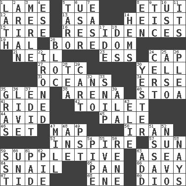 ACROSS 1. Unable to walk 5. Third day of the wk. 8. Needle holder 12. Ancient Greek god of war 13. White ___ sheet 14. Robbery 15. Hoop that covers a wheel 16. Dwellings 19. Actor Linden 20. Mood resulting from idleness 21. Famous astronaut Armstrong 23. Curvy letter 24. Head covering 27. College mil. group 30. Shout 31. Seas 34. Celtic language 35. Small, secluded valley 38. Sports stadium 40. Portico 41. Travel on an animal 42. Bathroom 44. Enthusiastic 45. Light colored 46. Put into a specified state 47. Atlas unit 50. SW Asia republic 53. Stimulate to action 57. Player for Phoenix 59. Supplementary 63. At sea 64. Slow-paced one 65. Baking dish 66. _ Jones' Locker 67. Periodic rise and fall of the sea level 68. Compass dir. 69. "Vaya con ____" DOWN 1. Thin strip of wood or metal 2. Believer in; advocate of (suffix) 3. Haggard of country music 4. Compass dir. 5. Edible starchy tuberous root 6. One who uses or employs something 7. Relaxation 8. Car or cant ending 9. Nervous spasm 10. Purpose 11. It is 14. Equivocates 17. Binary compound 18. Two (Sp.) 20. Alliance 22. Pressed 24. Foregone conclusion 25. In addition 26. Entreaty 28. Afternoon social gathering 29. Heavy open wagon 30. Of or pertaining to yesterday 32. Modern: prefix 33. Sever or remove by pinching or nipping 35. Pate de foie ____ 36. Not recorded 37. Prepare for publication 39. Chicken ___ king 43. Writer Wiesel 47. Place where flour is made 48. One (Scot) 49. Pacific Standard Time (abbr.) 51. Slender Brazilian palm 52. New (sp.) 54. Corncob 55. _ the terrible 56. French philosopher Descartes 58. Negative votes 59. Fast jet (abbr.) 60. Single; one (prefix) 61. Writing tablet 62. Sliced dessert 63. Say or write further