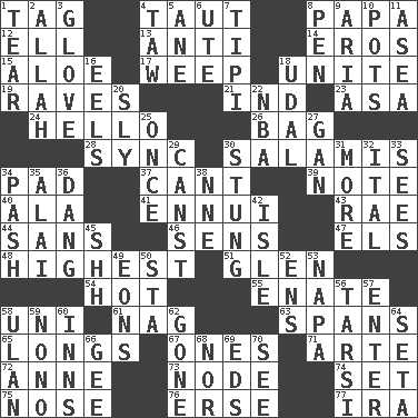 ACROSS 1. Label 4. Pulled tight 8. Dad 12. Pipe bend 13. Against 14. Greek god of love 15. _ vera 17. Shed a tear 18. Join together 19. All-night dance parties 21. Working for oneself (abbr.) 23. White ___ sheet 24. Phone greeting 26. Paper or plastic container 28. Synchronize (abbr.) 30. Deli grouping 34. Groovy apt. 37. Patter 39. Make mention of 40. According to 41. World-weariness 43. Actress Charlotte 44. Without 46. Elected reps. 47. Raised railways 48. Having the greatest elevation 51. Small, secluded valley 54. Being at a high temperature 55. Maternal 58. Single; one (prefix) 61. Tired old horse 63. Connects, as a bridge 65. Yearns 67. Singles 71. Johnson of "Laugh-In" 72. Queen of England 1702-14 73. Thickened enlargement 74. Put into a specified state 75. Olfactory organ 76. Celtic language 77. Retirement account (abbr.) DOWN 1. Lacerate 2. Assad's deity 3. Michael Jackson trademark 4. The 23rd letter of the Hebrew alphabet 5. A saturated hydrocarbon 6. Shoshoni 7. Native american tent (variation) 8. Fenced enclosure 9. Roberta Peters solo 10. Plant holders 11. Toward the sea 16. Snakelike fish 18. Freehold land 20. Roguish 22. Basketball assoc. 25. At one time in the past 27. Separate the seeds from cotton 29. 2nd pers. sing. pres. of can (arch.) 30. Feeling sharp psychological pain 31. Greater amount 32. Slanted text style (abbr.) 33. Perceives with the eye 34. Romantic infatuation 35. Jai ____ 36. Mild oath, euphamism for damn 38. Compass dir. 42. Small island 45. Quiet! 49. Immeasurably long periods of time 50. R.R. building 52. Followers of ems 53. California wine valley 56. Tarsus (plural) 57. Keyboard key 58. ____ Bator, Mongolia 59. Words to Nanette 60. Restaurants 62. Went 64. Bristle 66. Unit of force equal to gravity 68. Not either 69. Begley and Asner 70. Perceive with the eye