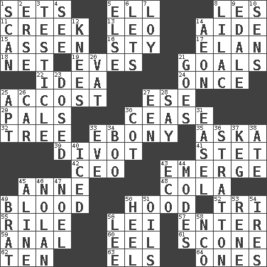 ACROSS 1. Arranges properly for use 5. Pipe bend 8. French article 11. Small stream 13. Lion 14. Assistant 15. NE Netherlands city 16. Filthy place 17. Style 18. Remaining after all deductions 19. Nights before holidays 21. Scores awarded for successful feats 22. The content of cognition 24. Single time 25. Buttonhole 27. Compass dir. 29. Friends 30. Desist 32. Woody plant 33. Black 35. "____ silly question..." 39. A piece of turf (Scot.) 41. Proofreading order 42. Corporate head (abbr.) 43. Develop 45. Singer Murray 48. Root beer relative 49. Vital fluid 50. Parka part 52. Three (prefix) 55. Cause heat under the collar 56. Luau accessory 57. Keyboard key 59. Of or related to the anus 60. Snakelike fish 61. Biscuitlike quick bread 62. "___ Little Indians" 63. Raised railways 64. Washington bills DOWN 1. Examine minutely or intensely 2. Celtic language 3. One of the two male reproductive glands 4. Observe 5. Otherwise 6. Allows 7. Myrna of the movies 8. Pale purple color 9. Peak District village in England 10. Elected reps. 12. Leg joints 14. A really long time 20. Large container 21. Leaves 23. Administered medicine 25. Fitting 26. Automobile 27. Car or cant ending 28. Declare 30. Small bed 31. Artist's stand 33. Night before a holiday 34. Sometimes accompanies a hiss 36. Ski resort town in Vermont 37. Barrel 38. Had dinner 40. On the rocks 43. Environmental prefix 44. Methods 45. Place in a line 46. Pitcher Ryan 47. Christmas carol 49. Naughty child 50. The bottom of a shoe or boot 51. Petroleums 53. French philosopher Descartes 54. Angers 56. Area sheltered from the wind 58. Non-commissioned officer (abbr.)