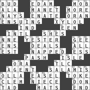 ACROSS 1. Partially opened flower 4. Dutch treat 8. Crowd into 11. Insect wing 12. French painter Edouard 14. Greater amount 15. Negative votes 17. Related on the mother's side 18. Northwest Algerian city 19. Taking place subsequently 21. Xylene (variant) 23. Working for oneself (abbr.) 24. Car or cant ending 25. International (abbr.) 27. "______ My Girl" (Turtles hit) 30. Compass dir. 31. Last 34. Unit of force equal to gravity 37. Followers of ems 38. Allots cards 39. Everything 40. Eastern Standard Time (abbr.) 41. Slept 43. Curvy letter 44. Romantic infatuation 45. Small island 47. Mouth or opening 49. Affectionate concern, for short 50. Rep 52. Deli grouping 56. Rounded earthenware pot or jar 57. Artist's stand 60. Puff or smoke 61. Clement's nick name 62. Sibling's daughter 63. Spanish title 64. Small amount or degree 65. Floor coverings 66. Conclusion DOWN 1. Object of repulsion 2. ____ Bator 3. 24-hour periods 4. Make improvements or corrections to 5. Mild oath, euphamism for damn 6. Santa ___, CA 7. Was introduced to 8. Person of subnormal intelligence 9. Spoken 10. Benjamin's nick name 13. John Ritter's dad 14. Undercover agent 16. Costume for a special activity 20. In an inward manner 22. Consenting reply 25. Restaurants 26. Egg locale 27. Staphylococcus 28. Aid 29. Celtic language 30. Born 32. Pulitzer Prize-winning author Ferber 33. Oceans 34. Highlander 35. Otherwise 36. Raised railways 42. Deli pickle 44. Baking dish 46. Scram, to a cat 47. Stared at amorously 48. 480, 500 or 516 sheets of paper 49. Stories 50. Silent film actress Nazimova 51. Nine, plus one 52. Religious group 53. Method 54. Picture 55. Transmit 56. Sep. follower 58. Direct toward a target or goal 59. Ocean