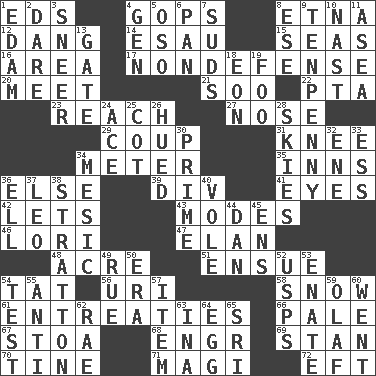 ACROSS 1. Begley and Asner 4. Republicans 8. Inactive volcano in Sicily 12. Mild oath, euphamism for damn 14. Son of Isaac 15. Oceans 16. Type of rug 17. Unrelated to defense, as in spending 20. Confront 21. "Barney Miller" actor Jack 22. Parent Teacher Assoc. 23. Arrive at 27. Sense of smell 29. Overturn; upset 31. Leg joint 34. Distance measurement 35. Taverns 36. Otherwise 39. HTML Container Element 41. Snake ____ (dice throw) 42. Allows 43. Methods 46. Australian parrot (variant) 47. Enthusiasm 48. 1/640 square mile 51. Take place subsequently 54. Make lace 56. RI univ. 58. Frozen precipitation 61. Pleas 66. Diluted with white 67. Portico 68. Engineer (abbr.) 69. Comedian Laurel of Laurel & Hardy 70. Prong on a fork 71. Wise men 72. Lizard (obsolete) DOWN 1. Dutch treat 2. Have the gumption 3. Contemptuous expression 4. Commissioned mil. rank 5. Bear (Spanish) 6. Baking dish 7. Beer foam 8. Compass dir. 9. 3-inch nail 10. Political cartoonist Thomas 11. At sea 13. Yard entry 18. A really long time 19. Egg _ yung 24. Adept person 25. Small bed 26. Took on color 28. Atmospheres 30. A-one 32. Compass dir. 33. Curvy letter 34. Of or pertaining to a meson 36. Pipe bend 37. Lion 38. Ski resort town in Vermont 40. Grand slam 44. One of the 12 tribes of Israel 45. Followers of ems 49. Regret 50. Epoch 52. United States Postal Service (abbr.) 53. Maternal 54. Trial 55. Opposed to 57. A whole individual unit 59. Norwegian king 60. Gone 62. Actress Charlotte 63. _ tizzy (2 wds.) 64. Oval reproductive body of a fowl 65. _ Lanka