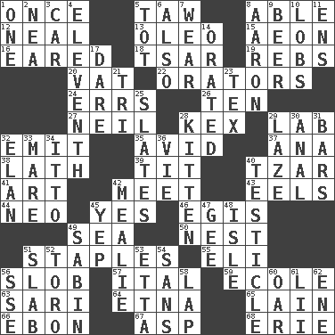 ACROSS 1. At one time in the past 5. The 23rd letter of the Hebrew alphabet 8. Competent 12. Anneal 13. Butter sub 15. Period of immesurable duration 16. Having ears or earlike features 18. Russian ruler of old 19. Confederate soldiers (slang) 20. Large container 22. Speakers 24. Blunders 26. "___ Little Indians" 27. Famous astronaut Armstrong 28. Dry husk or covering 29. Experiment locale 32. Send forth 35. Enthusiastic 37. Santa ___, CA 38. Thin strip of wood or metal 39. Teat (slang) 40. Russian ruler 41. Nonscientific branch of learning 42. Confront 43. Snakelike fish 44. Modern: prefix 45. Consenting reply 46. The front part of a cuirass 49. Ocean 50. Egg locale 51. Paper fasteners 55. Biblical high priest 56. Messy guy 57. Slanted text style (abbr.) 59. Learning spot: Fr. 63. Indian skirt 64. Inactive volcano in Sicily 65. (Had) reclined 66. Inky black, to poets 67. Cleo's killer 68. One of the Great Lakes DOWN 1. Single 2. Teachers' org. 3. 4-wheeled motor vehicle 4. Veterans Day date 5. Small child 6. In addition 7. Put on (as clothing) 8. Composer Copland 9. Fermented drink made from hops 10. Tennis shots 11. Followers of ems 14. Declaimed 17. Have the gumption 21. Three (prefix) 23. John Ritter's dad 25. Chalkboards 28. Baby cat 29. Goldbrick 30. Of or related to the anus 31. Drinking establishments 32. Style 33. Female horse 34. "Tell ____ the Marines!" 36. Compete 40. A testis 42. Ear of corn 45. Slangy assent 47. Turn to the right 48. Capri or Wight 49. Unit of acoustic absorption 51. Broad, flat, thick piece 52. "Corrida" creature 53. Singer James 54. Without 56. Compass dir. 58. Pet locale 60. Rowing implement 61. Cards in a Roman deck? 62. Compass dir.
