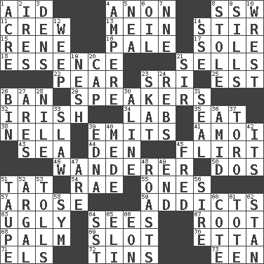 ACROSS 1. Assist 4. At once, immediately (arch.) 8. Compass dir. 11. Group working together 13. Count _ (2 wds.) 14. Move through with a circular motion 15. French philosopher Descartes 16. Light colored 17. Flatfish 18. Core 21. Exchanges for money 22. Lightbulb-shaped fruit 23. Indian title of respect (Mr.) 25. Eastern Standard Time (abbr.) 26. Forbid 29. Orators 32. From or relating to Ireland 34. Experiment locale 35. Ingest 38. 1994 drama film starring Jodie Foster 39. Sends forth 41. Mine, in Marseilles 43. Ocean 44. Lair 45. Talk or behave amorously 46. Roamer 50. Two (Sp.) 51. Make lace 54. Actress Charlotte 55. Washington bills 57. Came up 59. Inveterate users 63. Unsightly 64. Observes 67. Carrot, for example 68. Inside of hand 69. Groove 70. Singer James 71. Raised railways 72. Canisters 73. Car or cant ending DOWN 1. Land measure 2. Angers 3. Lairs 4. Electrical Unit 5. Teachers' org. 6. Lubricate 7. Compass dir. 8. Fur scarf 9. Beverly of Met fame 10. Take or capture by force 12. Shed a tear 14. Compass dir. 19. Delicate 20. Head covering 21. Title for a knight 23. Three-handed card game 24. Confederate soldiers (slang) 26. Storage container 27. Ancient Greek god of war 28. The longest river in the world 30. Place in a line 31. Lick closed 33. Cole _ (cabbage dish) 36. Among 37. "Corrida" creature 39. Pulitzer Prize-winning author Ferber 40. Ancient Persian 42. It is 45. Flintstone 47. "We ___ not amused" (Victoria) 48. Cooks with dry heat, as in an oven 49. Conclusion 51. Grayish beige 52. Therefore, facetiously 53. For Whom the Bell _____ 56. The founder of a family 58. Symbol (abbr.) 60. ____ d'Azur (French Riviera) 61. Haul 62. Comedian Laurel of Laurel & Hardy 64. Fast jet (abbr.) 65. Connecticut Ivy Leaguer 66. A really long time