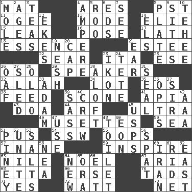 ACROSS 1. Floor covering 4. Ancient Greek god of war 8. Pacific Standard Time (abbr.) 11. Double curve, resembling the letter S 13. Method 14. Writer Wiesel 15. Path through which fluid escapes 16. Introduce or present, as a question 17. Thin strip of wood or metal 18. Gist 21. First name in cosmetics 22. Singe 23. Call ___ day 25. Compass dir. 26. Bear (Spanish) 29. Orators 32. Assad's deity 34. Car dealer's back yard 35. Greek goddess of the dawn 38. Nourish 39. Biscuitlike quick bread 41. Capital of Western Samoa 43. ___ good deed 44. Sandy's bark 45. Extremist 46. French bagpipes 50. Ocean 51. Product of festering 54. Compass dir. 55. I made a mistake 57. Silly 59. Motivate 63. "Death on the ____" 64. Christmas carol 67. Roberta Peters solo 68. Singer James 69. Celtic language 70. Small amounts or degrees 71. It is so 72. Electrical Unit 73. Fish or hair follower DOWN 1. Undercover agent 2. Matures 3. Afternoon social gatherings 4. Electrical Unit 5. Friend of Pooh 6. Begley and Asner 7. Perceive with the eye 8. Food holder 9. Settings 10. Giggle 12. Makes supply last 14. Raised railways 19. Soft 20. Head covering 21. Ewer handle 23. Picture 24. False hair 26. Clumsy lout 27. Downhill vehicle 28. Margarine 30. High up in or into the air 31. Lick closed 33. First of billions? 36. Elects 37. Male parent of an animal 39. Backtalk 40. Group working together 42. American Automobile Association (abbr.) 45. United States Postal Service (abbr.) 47. Purpose 48. Bathroom plumbing fixture 49. Period of immesurable duration 51. Abounding in pines 52. Join together 53. Table seasonings 56. Petty quarrel 58. Teachers' org. 60. SW Asia republic 61. Travel on or in a vehicle 62. 90 degrees 64. ___ Haven, CT 65. Mouth or opening 66. Eastern Standard Time (abbr.)