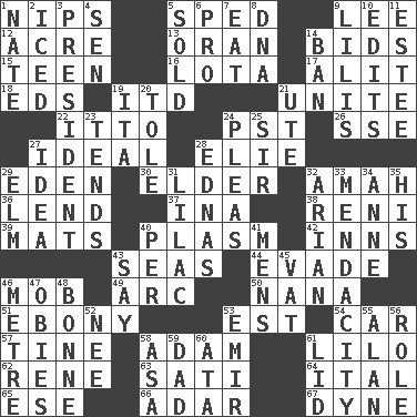 ACROSS 1. Cuts off 5. Broke a traffic law 9. Area sheltered from the wind 12. Land measure 13. Northwest Algerian city 14. Auction offers 15. Adolescent 16. Globular water bottle used in Asia 17. Came down and settled, as after flight 18. Begley and Asner 19. It would 21. Join together 22. "Tell ____ the Marines!" 24. Pacific Standard Time (abbr.) 26. Compass dir. 27. Perfect 28. Writer Wiesel 29. Paradise 30. A person who is older than you are 32. Housemaid 36. Grant temporary use of 37. _ tizzy (2 wds.) 38. Painter Guido (1575-1642) 39. Floor coverings 40. Suffix with ecto or cyto 42. Taverns 43. Oceans 44. Elude 46. Disorderly crowd 49. Curve 50. Nanny 51. Black 53. Eastern Standard Time (abbr.) 54. Auto 57. Prong on a fork 58. First man 61. _ and Stitch 62. French philosopher Descartes 63. Suttee (variant) 64. Slanted text style (abbr.) 65. Compass dir. 66. The sixth month of the Jewish calendar 67. Centimeter-gram-second unit of force DOWN 1. Nathan's nickname 2. On the rocks 3. Elected leader of a country 4. Elected rep. 5. Exchanged or delivered for money 6. Adept person 7. Erode 8. Heredity factor (abbr.) 9. Ms. Damita and namesakes 10. Prepares for publication 11. First name in cosmetics 14. Bar 19. Call ___ day 20. Lacquered or enameled metalware 21. Shoshoni 23. Watches over 24. Entreaties 25. Title for a knight 27. It may be bright or harebrained 28. Ferber et al. 29. Shade tree 31. Pale purple color 32. Believer in; advocate of (suffix) 33. Ananias' fault 34. Singer Murray 35. Part of HMS, perhaps 40. For each 41. Not women's 43. Declare 45. Large container 46. Distance measurement (Brit.) 47. Off-Broadway awards 48. Child's nurse 52. Born 53. Arab leader 55. ____ Jay Lerner 56. Hero or heavy, e.g. 58. White ___ sheet 59. Male parent 60. _ moment's notice (2 wds.) 61. Flaplike covering