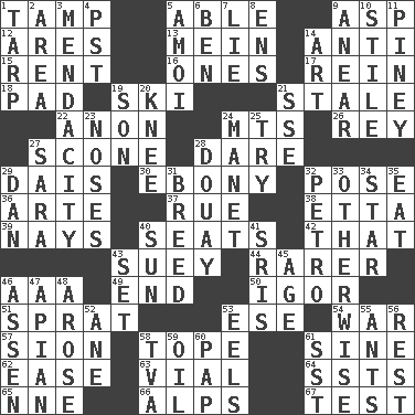 ACROSS 1. Pack (down) 5. Competent 9. Viper 12. Ancient Greek god of war 13. Count _ (2 wds.) 14. Against 15. Monthly bill 16. Singles 17. It's straight from the horse's mouth 18. Writing tablet 19. What Jean-Claude Killy likes to do 21. Lacking originality or spontaneity 22. At once, immediately (arch.) 24. Mountains (abbr.) 26. Marina Del _, California 27. Biscuitlike quick bread 28. Have the gumption 29. Raised platform 30. Black 32. Airs 36. Johnson of "Laugh-In" 37. Sorrow 38. Singer James 39. Negative votes 40. Theater features 42. Not this but _ 43. Chop _ 44. More valued for its uncommonness 46. American Automobile Association (abbr.) 49. Conclusion 50. Russian composer Stravinsky 51. Small fatty European fish 53. Compass dir. 54. Armed conflict 57. The Jewish people; Israel 58. Drink excessively 61. Trig term 62. Comfort 63. Small bottle 64. Fast planes 65. Compass dir. 66. High mountains 67. Trial DOWN 1. Canvas cover 2. Length times width 3. Ananias' fault 4. Pacific Standard Time (abbr.) 5. Mine, in Marseilles 6. Benjamin's nick name 7. Untruth 8. Followers of ems 9. Approach 10. Vertical member of a panel or frame 11. Abounding in pines 14. Tate display 19. Manchild 20. Leg joint 21. Compass dir. 23. Olfactory organs 24. French painter Edouard 25. Attempt 27. "Two Mules for Sister ____" 28. A city in N France, SE of Calais 29. One of the 12 tribes of Israel 31. A special lineage 32. Stone: prefix 33. Else 34. Play the lead 35. Consume 40. Player for Phoenix 41. Indian titles of respect 43. Arrange properly for use 45. Mature 46. NE Netherlands city 47. Bee-related 48. Came up 52. One (Scot) 53. Snakelike fish 55. Pismires 56. Repose 58. Federal power corp. 59. Petroleum 60. Infant food 61. Fast jet (abbr.)
