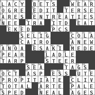 ACROSS 1. Made of lace 5. Stakes 9. Put on (as clothing) 13. Legendary monster 14. Prepare for publication 15. Laconic 16. Ancient Greek god of war 17. Pleas 19. Born 20. Lyricist Gershwin 21. It would 22. Erode 23. Supplemented with great effort 25. Personal Computers (abbr.) 26. Major League Baseball Commissioner Bud 30. Root beer relative 34. Capital of Egypt 35. Afresh 36. Small Philippine buffalo 39. 1973 Nobel Price Winner (Physics) Leo 42. Ancient Persian 43. Lightbulb-shaped fruit 44. Dipping utensil 46. Canvas cover 47. Navigate 48. Ocean 51. Labels 54. Sep. follower 57. Cleo's killer 58. Curvy letter 60. Shoshoni 62. Conciliate 65. 154 in Roman numerals 66. "_____ Recall" 67. Johnson of "Laugh-In" 68. Diluted with white 69. Moved rapidly 70. Anneal 71. Matures DOWN 1. Grant temporary use of 2. Match 3. Small stream 4. Consenting reply 5. Fermented drink made from hops 6. Pulitzer Prize-winning author Ferber 7. Teat (slang) 8. Empty completely 9. Soggy 10. One of the Great Lakes 11. At sea 12. State of inaction 15. Small boys 18. And so on (abbr.) 20. The content of cognition 24. Fortification 27. Falsehood 28. Big collection agency 29. Scores awarded for successful feats 30. Device for capturing images 31. Single 32. Directed 33. Deep reverence 36. Fitting 37. Teachers' org. 38. Boat paddle 40. Krazy ___ of comics 41. Binary compound 45. Allows 48. Move on water 49. Eastern Standard Time (abbr.) 50. Bee-related 52. Russian prison camp 53. Vertical member of a panel or frame 54. Elects 55. Riding implement 56. Carry 58. Singer James 59. Sew up the eyelids of hawks and falcons 61. Nights before holidays 63. Writing tablet 64. "We ___ not amused" (Victoria) 65. Tax preparer (abbr.)