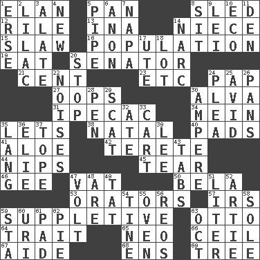 ACROSS 1. Flair 5. Baking dish 8. Downhill vehicle 12. Cause heat under the collar 13. _ tizzy (2 wds.) 14. Sibling's daughter 15. Cole _ (cabbage dish) 16. Census information 19. Ingest 20. Legislator 21. Penny 23. And so on (abbr.) 24. Infant food 27. I made a mistake 30. Inventor's middle name 31. Medicinal drug used to evoke vomiting 34. Count _ (2 wds.) 35. Allows 38. Brizilian seaport 40. Groovy apts. 41. Medicinal plant 42. Cigar-shaped 44. Cuts off 45. Lacerate 46. Turn to the right 47. Large container 50. Actor Lugosi 53. Speakers 57. Big collection agency 59. Supplementary 63. "Beetle Bailey" pooch 64. Distinguishing feature 65. Modern: prefix 66. To provide with a ceiling 67. Helper 68. Followers of ems 69. Relationship diagram DOWN 1. Celtic language 2. Pale purple color 3. Having winglike extensions 4. ___ Haven, CT 5. Corncob 6. At once, immediately (arch.) 7. California wine valley 8. Be seated 9. Luau accessory 10. Environmental prefix 11. Lair 14. Drug cop 17. Shoshoni 18. Car dealer's back yard 20. Halt 22. Annoying sounds 24. Entreaty 25. Enthusiastic 26. Baking dishes 28. Fenced enclosure 29. Go away! 30. Electrical Unit 32. Had dinner 33. Draw slowly or heavily 35. Long (Scottish) 36. Writer Wiesel 37. Drink excessively 39. Area sheltered from the wind 43. Bar bills 47. Electrical Unit 48. "We ___ not amused" (Victoria) 49. Make lace 51. 61 cubic inches 52. Nick name for Arthur 54. Prong on a fork 55. Baking chamber 56. Vintage cars 58. Not divided or shared with others 59. R.R. building 60. RI univ. 61. Writing tablet 62. Sliced dessert 63. Sep. follower