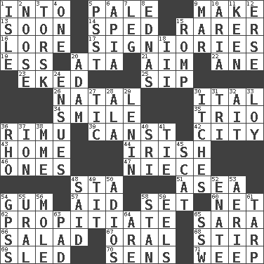 ACROSS 1. To the inside or interior of 5. Diluted with white 9. Cause to be 13. Within a short period 14. Hurried 15. Less widely known 16. Old wives' tales, e.g. 17. Seigniories (variant) 19. Double-curved letter 20. _ moment's notice (2 wds.) 21. Direct toward a target or goal 22. One (Scot) 23. Supplemented with great effort 25. Small drink 26. Relating to or accompanying birth 30. Slanted text style (abbr.) 34. Grin 35. Musical group of three 36. Tall New Zealand timber tree 39. 2nd pers. sing. pres. of can (arch.) 42. Municipality 43. Residence 44. From or relating to Ireland 46. Singles 47. Sibling's daughter 48. R.R. building 51. At sea 54. Chewing product 57. Assist 58. Arrange properly for use 60. Fish or hair follower 62. Conciliate 65. "Two Mules for Sister ____" 66. Vegetable dish 67. Relating to the mouth 68. Tumult 69. Downhill vehicle 70. Elected reps. 71. Shed a tear DOWN 1. Small island 2. Trap for birds or small mammals 3. Cod relative 4. Single 5. Inconspicuous attention getter 6. Capital of Western Samoa 7. Part of a journey 8. Ferber et al. 9. Spoil 10. Operatic vocal solo 11. Peachy ____! 12. Celtic language 15. Play 18. One more than two 20. First man 24. Follows as a consequence or result 27. Nervous spasm 28. According to 29. Soviet premier 1918-24 30. Skin irritations 31. Three (prefix) 32. Small island 33. Myrna of the movies 36. 17th letter of the Greek alphabet 37. Electrically charged atom 38. Madame (abbr.) 40. Indian title of respect (Mr.) 41. Standoff 45. Scram! 48. Alleged 49. Teat (slang) 50. Goodbye (Sp.) 52. Related on the mother's side 53. Nest on high 54. Global Positioning Systems (abbr.) 55. Mountain range 56. Undercover agent 58. Comedian Laurel of Laurel & Hardy 59. Snakelike fish 61. Canvas cover 63. Writing tablet 64. "We ___ not amused" (Victoria) 65. Compass dir.