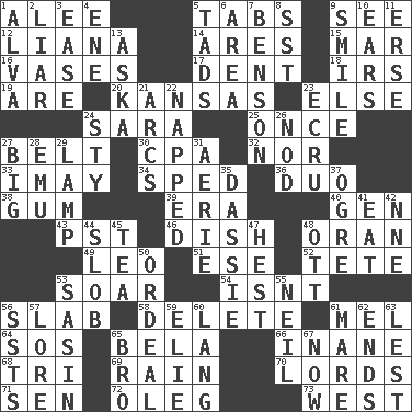 ACROSS 1. Toward shelter 5. Bar bills 9. Perceive with the eye 12. Climbing, woody, usually tropical vines 14. Ancient Greek god of war 15. Impair 16. Flower holders 17. Undesirable depression on a surface 18. Big collection agency 19. "We ___ not amused" (Victoria) 20. Sunflower state 23. Otherwise 24. "Two Mules for Sister ____" 25. Single time 27. Waist strap 30. Tax preparer (abbr.) 32. Not either 33. "If ____ say so..." 34. Broke a traffic law 36. Superhero pair 38. Chewing product 39. Period 40. Commissioned mil. rank 43. Pacific Standard Time (abbr.) 46. Food container 48. NW Algerian seaport 49. Lion 51. Compass dir. 52. Wig 53. Fly high 54. Is not 56. Thick slice 58. Keyboard key 61. Cartoonist voice _ Blanc 64. Distress signal 65. Actor Lugosi 66. Lacking in sense or substance 68. Three (prefix) 69. Precipitation 70. Nobles 71. Elected rep. 72. Cassini of fashion 73. 270 degrees DOWN 1. Inventor's middle name 2. One who doesn't tell the truth 3. Comfort 4. Compass dir. 5. Small amounts or degrees 6. Type of rug 7. Gillaume's butler role 8. Fast jet (abbr.) 9. Grin 10. Hearing organs 11. Celtic language 13. "____ silly question..." 21. Arches 22. Slept 23. Shade of tan 24. Filthy place 26. Lower and raise head in agreement 27. Large 28. Australian flightless bird 29. Desk light 31. Nest on high 35. Hyrax 37. Legendary monster 41. Erode 42. Compass dir. 44. Oscar Madison type 45. Afternoon social gathering 47. Command 48. Baseball player Mel 50. Severe or trying experience 53. Indian antelope 55. Famous astronaut Armstrong 56. Fast planes 57. Old wives' tales, e.g. 59. Writer Wiesel 60. Long (Scottish) 61. Female horse 62. Conclusions 63. For fear that 65. Sis' sibling 67. Immediately