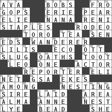 ACROSS 1. Actress Gardner 4. Moves up and down 8. From 11. Republicans 13. One of the Great Lakes 14. Lightbulb-shaped fruit 15. Writer Wiesel 16. Grandmother 17. Painter Guido (1575-1642) 18. Paper fasteners 21. Cowboy competition 22. "Corrida" creature 23. Afternoon social gathering 25. Elected rep. 26. Begley and Asner 29. Nomad 32. Ms. Damita and namesakes 34. Environmental prefix 35. Baseball player Mel 38. A hard, heavy blow 39. Expletives 41. A blast of a horn 43. Lion 44. Single 45. Thespian 46. News announcer 50. Biblical high priest 51. Fish or hair follower 54. Girls' org. (abbr.) 55. Makes supply last 57. Amid 59. Nestling 63. Male parent of an animal 64. Put down 67. Length times width 68. _ mater 69. Queen of England 1702-14 70. A home for chicks 71. Sodium hydroxide 72. Necklace unit 73. A female animal or person DOWN 1. Matures 2. Electrical Unit 3. Capital of Western Samoa 4. Gillaume's butler role 5. Mouth or opening 6. Storage container 7. Ocean 8. Gives food to 9. The wife of a rajah (variant) 10. Greek mythologigal hunter 12. Back-to-school mo. 14. Adept person 19. Coldest temperatures 20. Period 21. Actress Charlotte 23. Technology 24. Greek god of love 26. Raised railways 27. Deli pickle 28. Turn sharply 30. Prevent from occurring 31. College mil. group 33. Composer Stravinsky 36. Lug 37. Instrument 39. I made a mistake 40. Small Philippine buffalo 42. Three (prefix) 45. Ancient Greek god of war 47. Oval reproductive body of a fowl 48. Watched over 49. Make supply last 51. Rhinal 52. Poet Dickinson 53. Singer Mel 56. Comedian Laurel of Laurel & Hardy 58. Teachers' org. 60. Angers 61. Delicate 62. Yard entry 64. Experiment locale 65. A saturated hydrocarbon 66. _ tizzy (2 wds.)