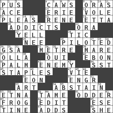 ACROSS 1. Fluid product of inflammation 4. Crow sounds 8. Mouths or openings 12. Adept person 13. One of the Great Lakes 14. Short-tailed, large-bodied rat 15. Entreaties 18. French philosopher Descartes 19. Singer James 20. Inveterate users 22. Mouth or opening 23. Shout 24. Nervous spasm 25. Born 26. Manned the helm 30. Girls' org. (abbr.) 33. Distance measurement (Brit.) 36. Female horse 37. Water jar 39. Fr. "Yes" 40. Inky black, to poets 41. Inside of hand 42. Foe 44. Fast jet (abbr.) 45. Paper fasteners 47. Compete 50. A really long time 51. Engineer (abbr.) 53. Tate display 54. Choose not to consume 57. Inactive volcano in Sicily 59. Docile 61. More peculiar 63. Tree-dwelling hopper 64. Prepare for publication 65. Compass dir. 66. Prong on a fork 67. Sums up 68. A female animal or person DOWN 1. Infant food 2. Southern CA. univ. 3. Sleazy 4. Foregone conclusion 5. Ancient Greek god of war 6. Acquire through effort 7. Observe 8. Conquer 9. Roll call or roster of names 10. Keyboard modifier key 11. Ocean 16. An important port of Yemen 17. Filth; sediment 21. Clement's nick name 22. Lubricate 24. Standoff 26. Demure 27. Bar bills 28. Greek god of love 29. Gouge 30. Republicans 31. Narrow board 32. Silent film actress Nazimova 34. Immeasurably long periods of time 35. Third day of the wk. 38. Electrical Measurement 42. Car or cant ending 43. Jacques Cousteau's middle name 46. Car dealer's back yard 48. To the inside or interior of 49. Mild oath 52. Amusement-park features 53. At once, immediately (arch.) 54. Among 55. Stakes 56. Delicate 57. Bank Draft (abbr.) 58. Three (prefix) 59. Beverage made from leaves 60. Find the sum of 62. To sift