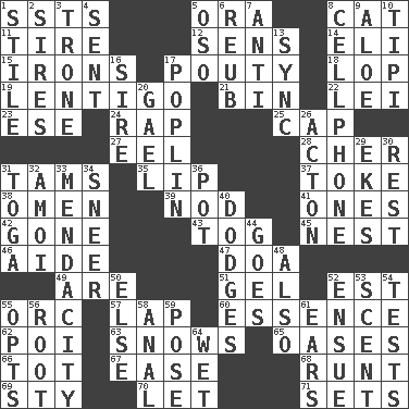 ACROSS 1. Fast planes 5. Mouth or opening 8. Feline 11. Become fatigued 12. Elected reps. 14. Connecticut Ivy Leaguer 15. Removes the wrinkles 17. Inclined to pout 18. Chop off 19. Small, flat, pigmented spot on the skin 21. Storage container 22. Flowery wreath 23. Compass dir. 24. Hit sharply and swiftly 25. Head covering 27. Snakelike fish 28. "Mermaids" star 31. Scottish caps 35. Mouth edge 37. Casino tip 38. Sign of things to come 39. Allow head to fall sleepily 41. Singles 42. Went 43. Coat; cloak 45. A home for chicks 46. Assistant 47. ___ good deed 49. "We ___ not amused" (Victoria) 51. Set 52. Eastern Standard Time (abbr.) 55. The grampus (Milton) 57. Infant locale 60. Center 62. Luau course 63. Overwhelms 65. Fertile tracts in a desert 66. Small child 67. Comfort 68. The smallest animal of a litter 69. Filthy place 70. Allow 71. Arranges properly for use DOWN 1. Vertical member of a panel or frame 2. Fathers 3. Marketplace scale 4. Emitted 5. Bear (Spanish) 6. Reuben's nickname 7. Opposed to 8. Portable communications device 9. Medicinal plant 10. Native american tent (variation) 13. Synchronize (abbr.) 16. Father 17. Cotton for raincoats, e.g. 20. Highlander 26. 13-14th century defensive garment 29. Supplements with great effort 30. Respite 31. Ancient Roman robe 32. Mine, in Marseilles 33. Ananias' fault 34. Contemptuous expression 36. Plant holder 40. Evades 44. Travels 48. In addition 50. Otherwise 52. Take place subsequently 53. Aroma 54. Trials 55. Chooses 56. Carrot, for example 58. Of or related to the anus 59. Introduce or present, as a question 61. Hearing organs 64. Dripping