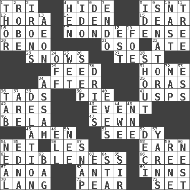 ACROSS 1. Three (prefix) 4. Flintstone garb 8. Is not 12. Israeli folk dance 14. Genesis locale 15. Letter starter 16. Mitch Miller's instrument 17. Unrelated to defense, as in spending 20. Former U.S. Attorney General Janet 21. Bear (Spanish) 22. Had dinner 23. Overwhelms 27. Trial 29. Nourish 31. Residence 34. Following 35. Mouths or openings 36. Bits 39. Sliced dessert 41. United States Postal Service (abbr.) 42. Ancient Greek god of war 43. Incident 46. Actor Lugosi 47. Stitched 48. So be it 51. Sleazy 54. Remaining after all deductions 56. French article 58. Merit 61. The property of being fit to eat 66. Algonquian 67. Small Philippine buffalo 68. Against 69. Restaurants 70. Long (Scottish) 71. Lightbulb-shaped fruit 72. Arrange properly for use DOWN 1. Son of Odin 2. Loose flowing garment 3. Removes the wrinkles 4. Layer 5. Wedding promise 6. Lair 7. Inside; within (prefix) 8. Binary compound 9. Elected representatives 10. Political cartoonist Thomas 11. Family _ (genealogy) 13. Period of immesurable duration 18. Eastern Standard Time (abbr.) 19. Enemy 24. No longer planned or scheduled 25. Soggy 26. Ooze 28. Yell 30. Frees from moisture 32. Atlas unit 33. Double-curved letter 34. Indian state 36. Keyboard key 37. "We ___ not amused" (Victoria) 38. Accusation by an informer 40. Nights before holidays 44. She-sheep 45. Compass dir. 49. Pipe bend 50. Born 52. Tenth: prefix 53. Entertaining tales 54. Actress Patricia 55. Pulitzer Prize-winning author Ferber 57. Fastener 59. French philosopher Descartes 60. Egg locale 62. Container for groceries 63. Compass dir. 64. R.R. building 65. Title for a knight