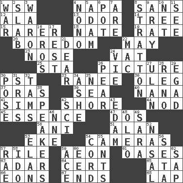 ACROSS 1. Compass dir. 4. California wine valley 8. Without 12. Insect wing 13. Scent 14. Family _ (genealogy) 15. More valued for its uncommonness 18. Nathan's nickname 19. Assign a rank or rating to 20. Mood resulting from idleness 22. Fifth month 23. Olfactory organ 24. Large container 25. R.R. building 26. Photo 30. Pacific Standard Time (abbr.) 33. The wife of a rajah (variant) 36. Cassini of fashion 37. Mouths or openings 39. Ocean 40. Grandmother 41. Simple or foolish person 42. Dinah or Pauly 44. Dreamland 45. Center 47. Two (Sp.) 50. Cuckoo 51. Actor Alda or Thicke 53. Make supply last 54. Devices for capturing images 57. Cause heat under the collar 59. Period of immesurable duration 61. Fertile tracts in a desert 63. The sixth month of the Jewish calendar 64. Foregone conclusion 65. "One Day ___ Time" 66. Immeasurably long periods of time 67. Extremities 68. Infant locale DOWN 1. Armed conflict 2. Thick slice 3. Make _____ (do battle with) 4. Words to Nanette 5. First man 6. Plant holder 7. "We ___ not amused" (Victoria) 8. Ski resort town in Vermont 9. Like ___ of sunshine 10. Remaining after all deductions 11. Observe 16. Greek god of love 17. Repose 21. Letter starter 22. Apple computer (short form) 24. Compete 26. Lightbulb-shaped fruit 27. ____ Bator, Mongolia 28. Western Nevada city 29. Mild oath 30. Airs 31. Indian titles of respect 32. Scottish caps 34. American tennis player Robert 35. Modern: prefix 38. Orators 42. _-fi 43. Dutch treat 46. Compass dir. 48. Margarine 49. "Two Mules for Sister ____" 52. Relating to the nose 53. Enthusiasm 54. Drawstring 55. Pismires 56. Bristle 57. Actress Charlotte 58. Wedding promise 59. Adept person 60. Car or cant ending 62. Plant excrement